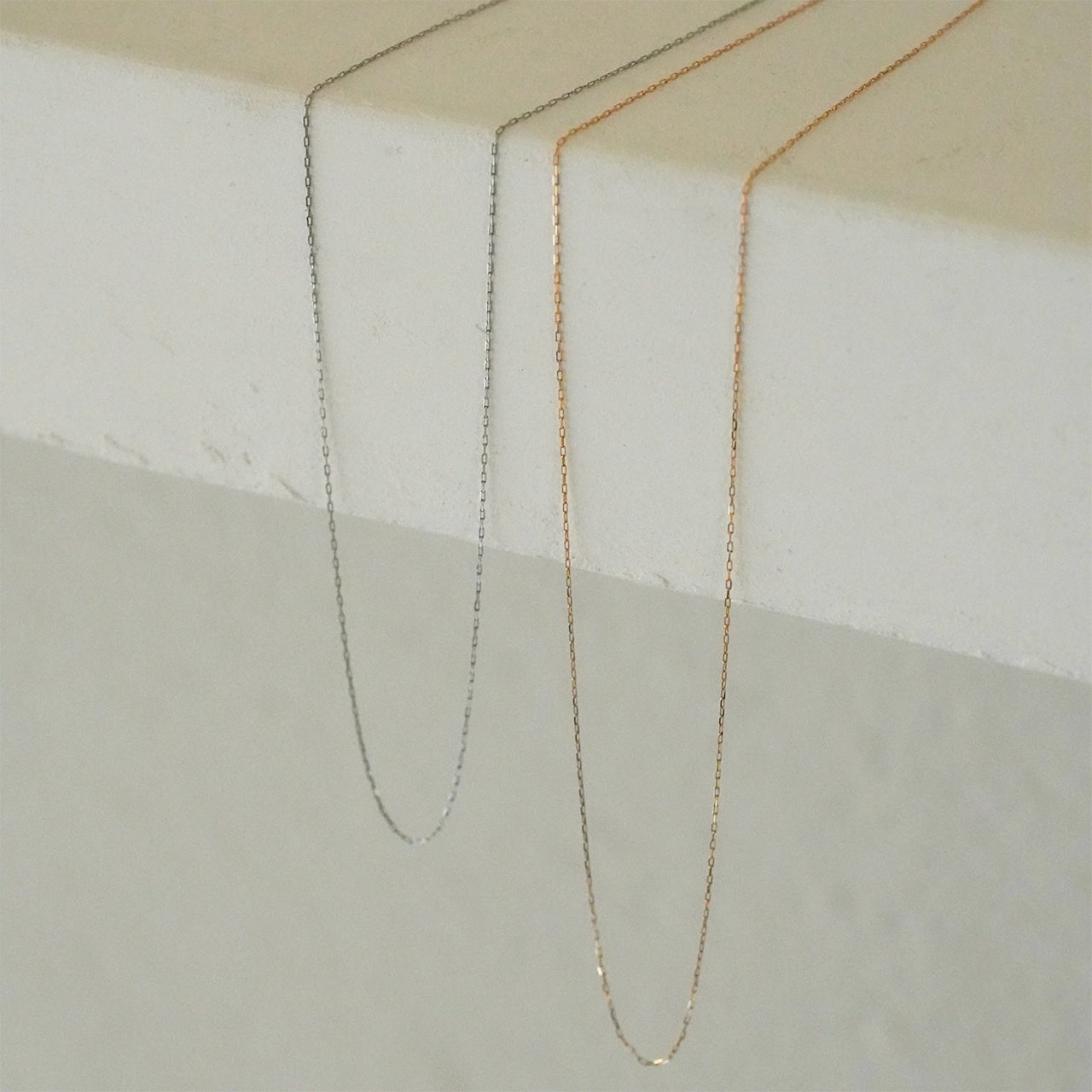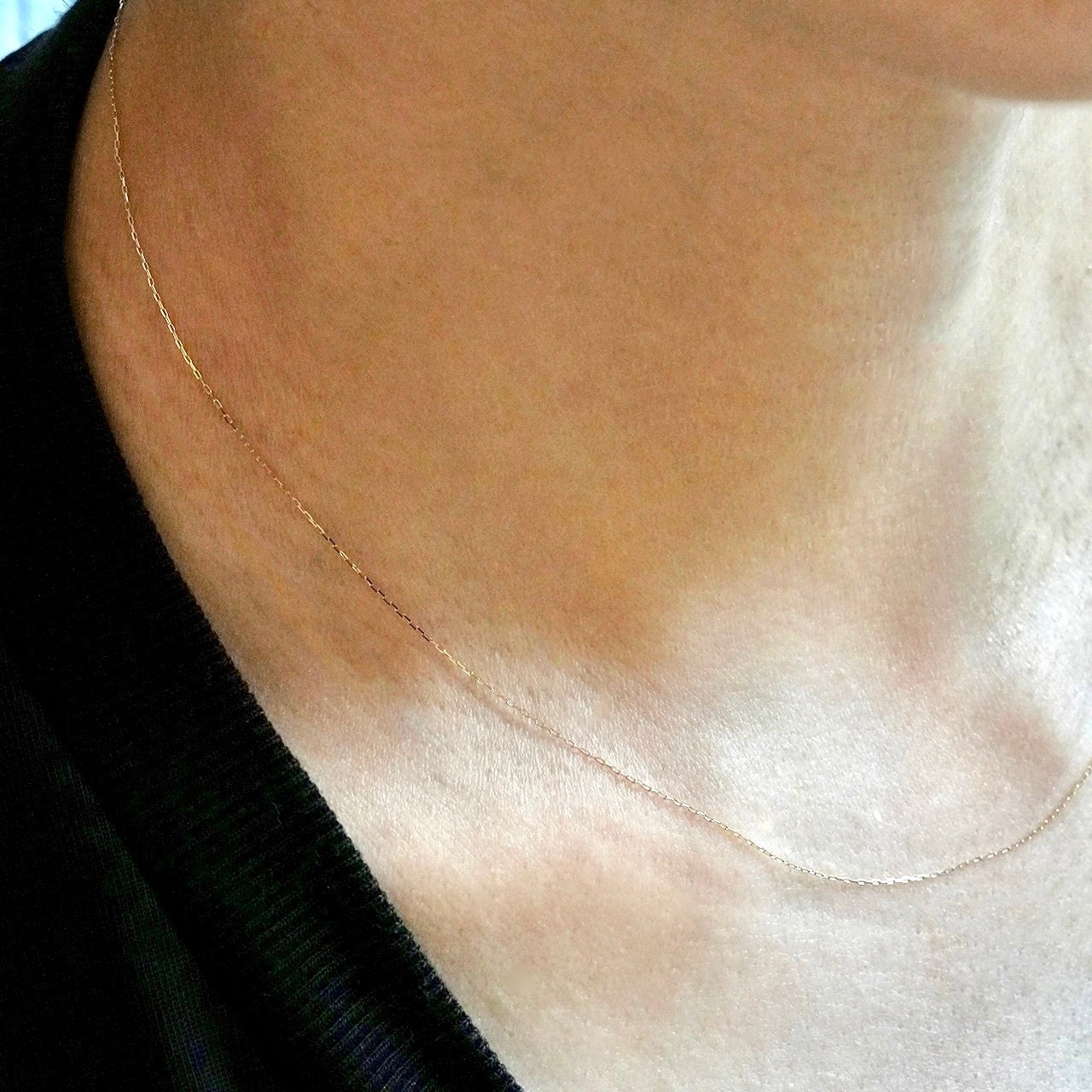 近年続く金の価格高騰から日本のチェーンメーカーが「少ない量の素材からいかに作れるか」を競い合った結果生まれた髪の毛レベルの極細18金イエローゴールドチェーン。