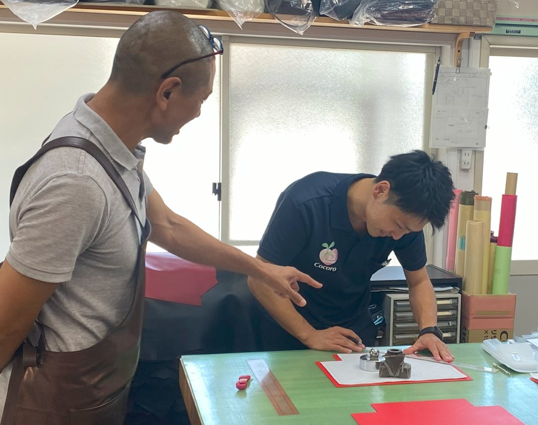こころらいず従業員の紹介がきっかけで、製品の作成時に発生する革の端切れを提供頂く流れとなった。その端切れを使用しこころらいずでの自社製品を考え、利用者には“革の仕分け”“パーツ付け”“裁断”“縫う”など様々な作業工程を担い日々生産活動行っている。