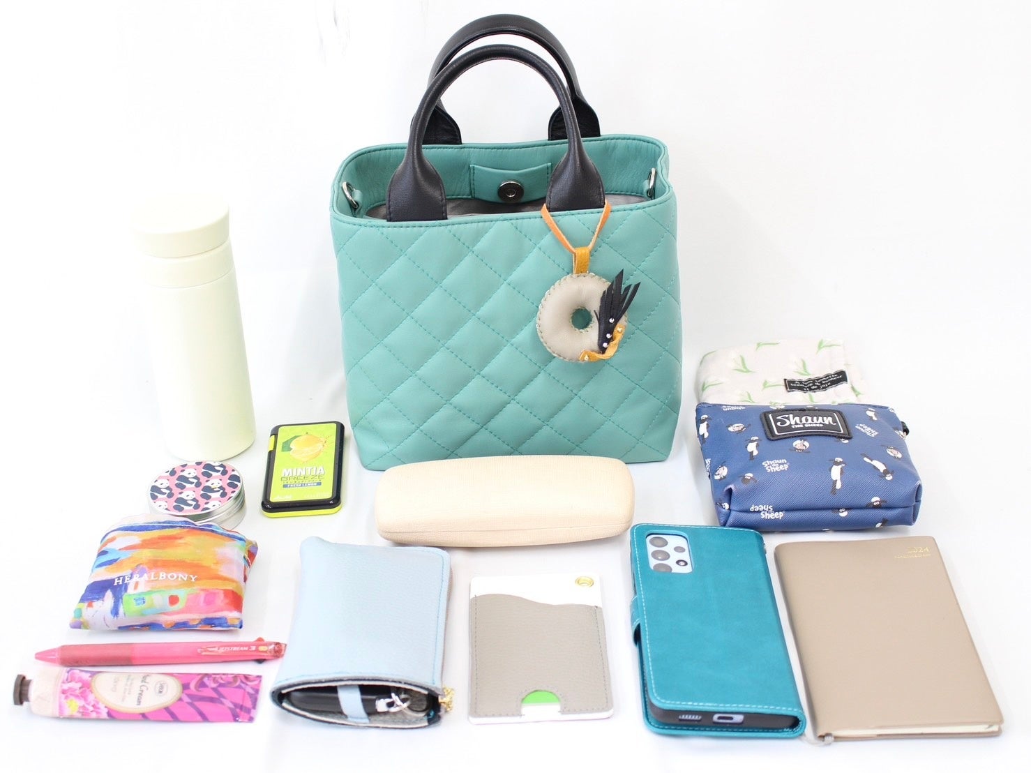 例)携帯、鍵、財布、ハンカチ、化粧ポーチ、折りたたみ傘等 収納することができます。