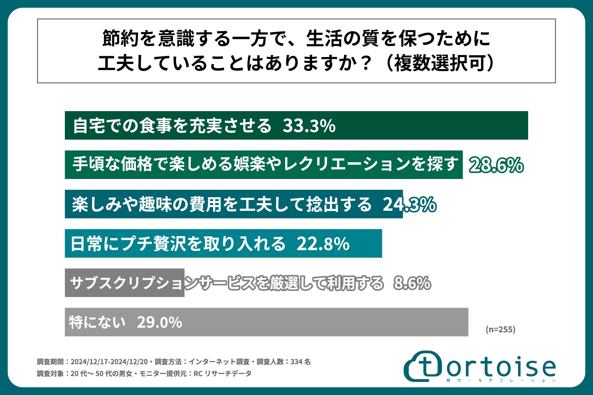 節約を意識する一方、生活の質を保つために主に工夫していることは「自宅での食事の充実」や「手頃な価格で楽しめる娯楽探し」