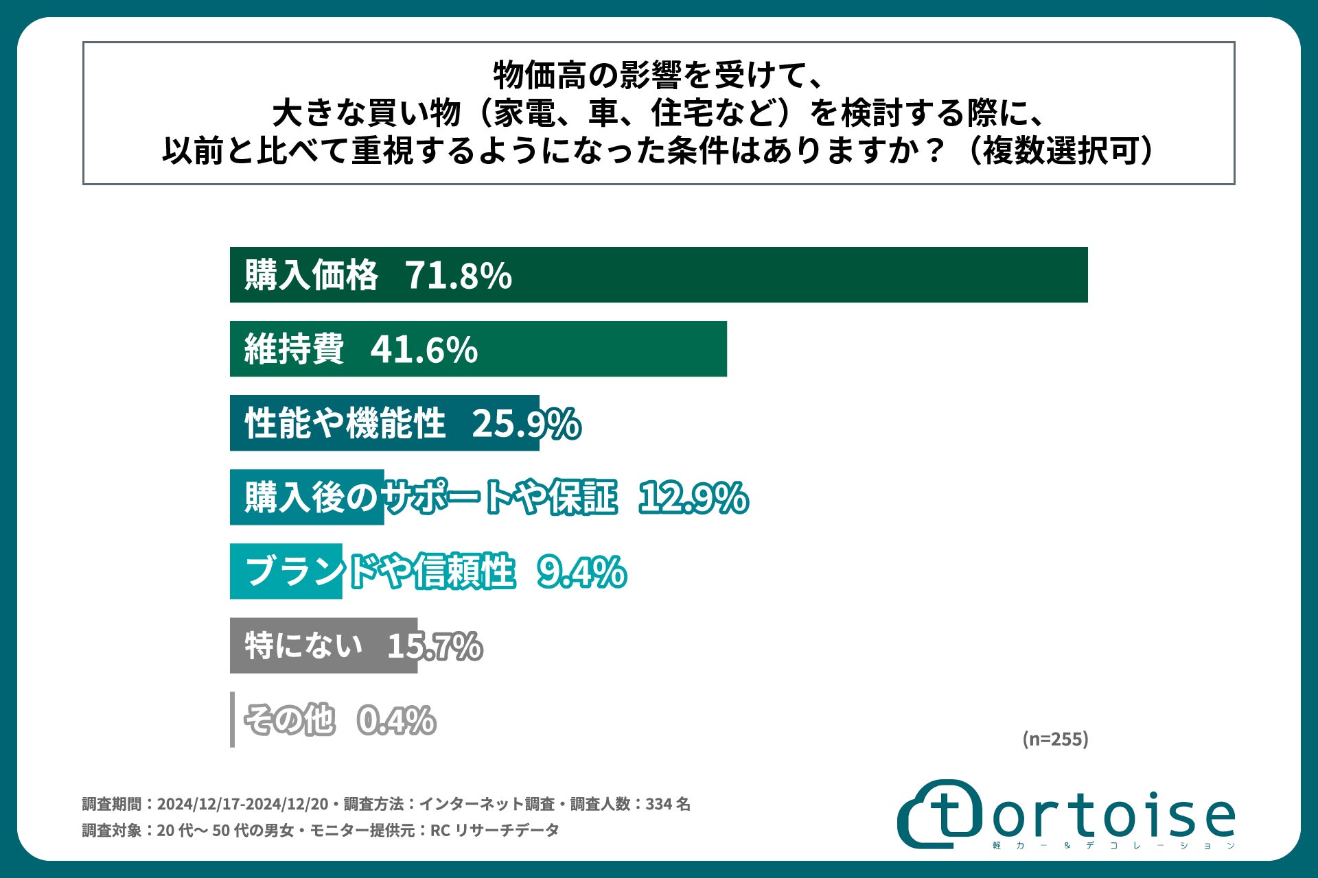 物価高の影響を受けて、大きな買い物(家電、車、住宅など)を検討する際に、重視するようになった主な条件は「購入価格」と「維持費」