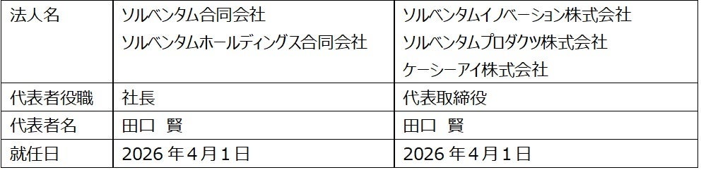 2026年4月1日付にて、ソルベンタム日本法人5社の代表は、以下の通りです。