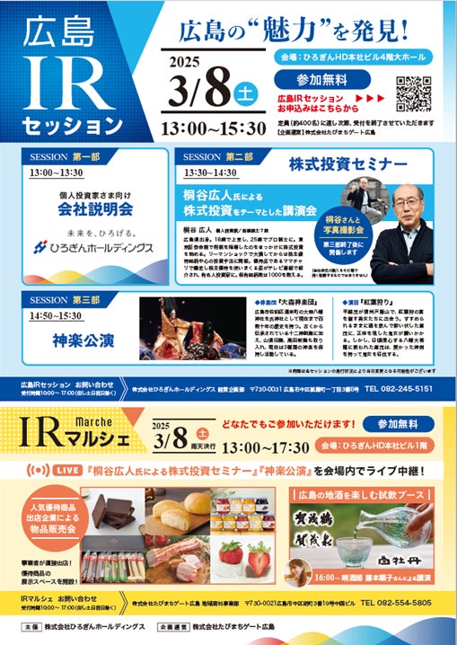 株式会社ひろぎんホールディングス(社長 部谷 俊雄)では、IRセッションおよびIRマルシェを開催いたしますので、下記のとおりお知らせいたします。