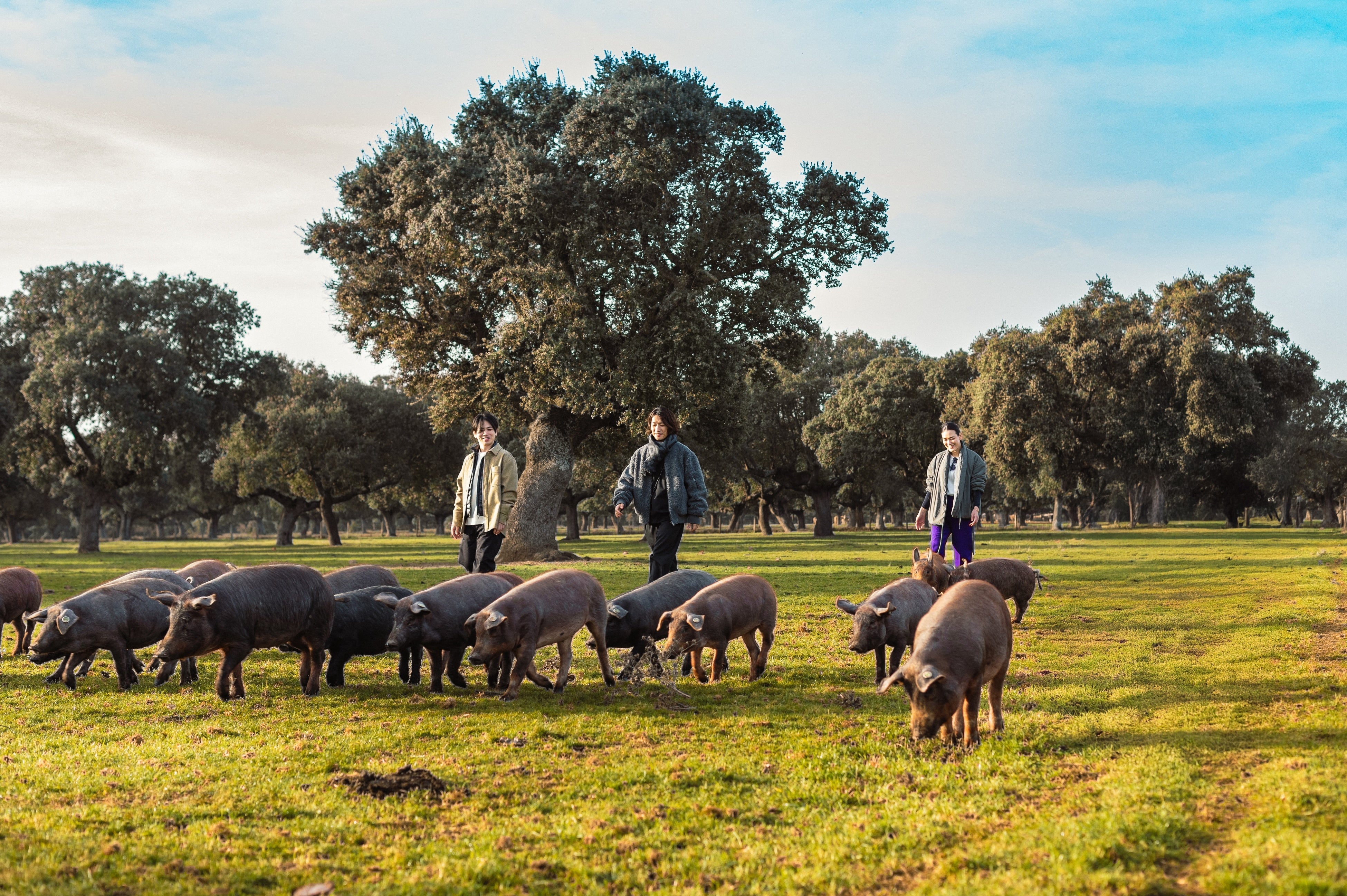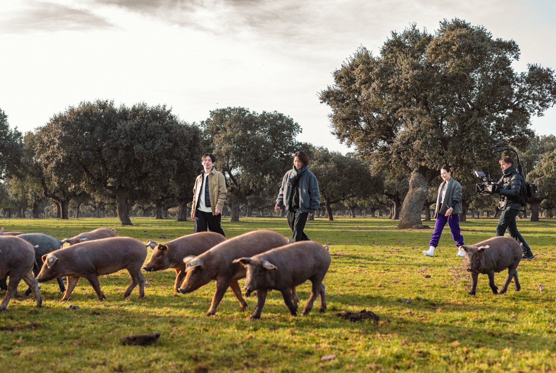 翌日は、ヨーロッパ最古の持続可能な生態系とされるデヘサ(牧草地)で、「自然」と「サステナビリティ」に焦点を当てた撮影が行われました。吉田は「世界で一つしかないものが生まれる場所を発見することは感動的だ」という「自然」篇の1シーンを撮影し、デヘサの広大な自然環境や自由に走り回るイベリコ豚との触れ合いを通じて、その特別な存在感を描きました。同じくデヘサを舞台にした「サステナビリティ」篇では、野原が「製品の成功には地球とのつながりが欠かせない」という1シーンを体現し、自然と共生する姿勢を強調しました。
