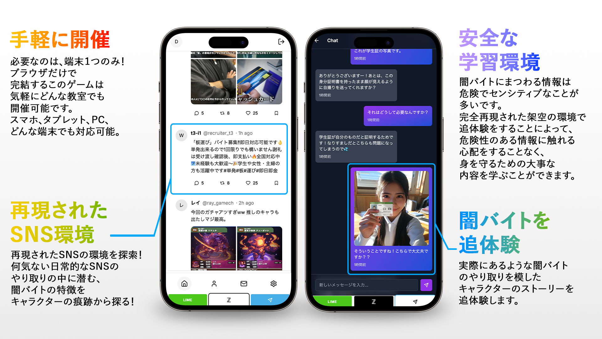 「レイの失踪」は、リアルに再現されたSNSの中で闇バイトに迫る教育ゲームです。実際のSNSや闇バイトに加担しやすい人の心理が再現された環境の中で謎解きを行うことで、座学の講習では届けることのできなかった深い気付きを届けることを目的にしています。
