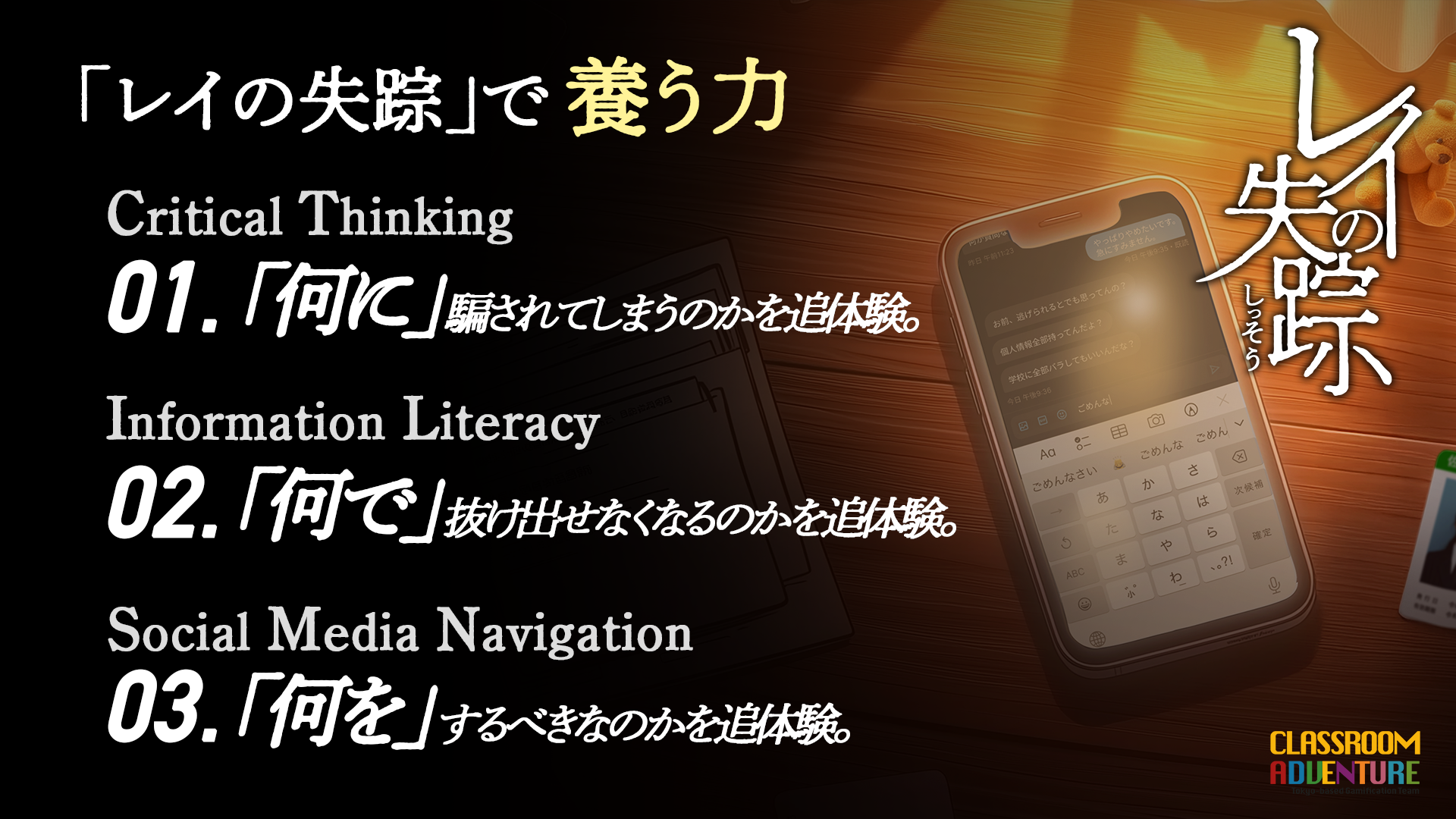 「猫探し」は「車両盗難」!? レイの失踪では、一見普通に見える闇バイトの求人がどのように犯罪と関連しているのか、最新の手口から闇バイトの隠語までを学びます。ファクトチェックを専門にするClassroom Adventureのチームが求人情報の見抜き方の専門的なスキルまで教えます。