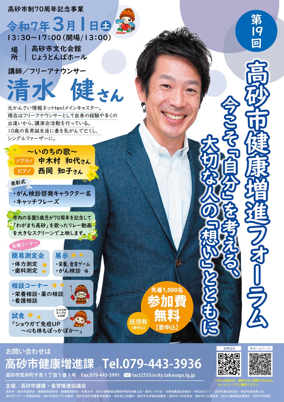 第19回高砂市健康増進フォーラム フリーアナウンサー清水健さんを講師にお招きした「健康」にまつわる記念講演を実施します 高砂市制70周年記念事業もいよいよ最終章となります!!!