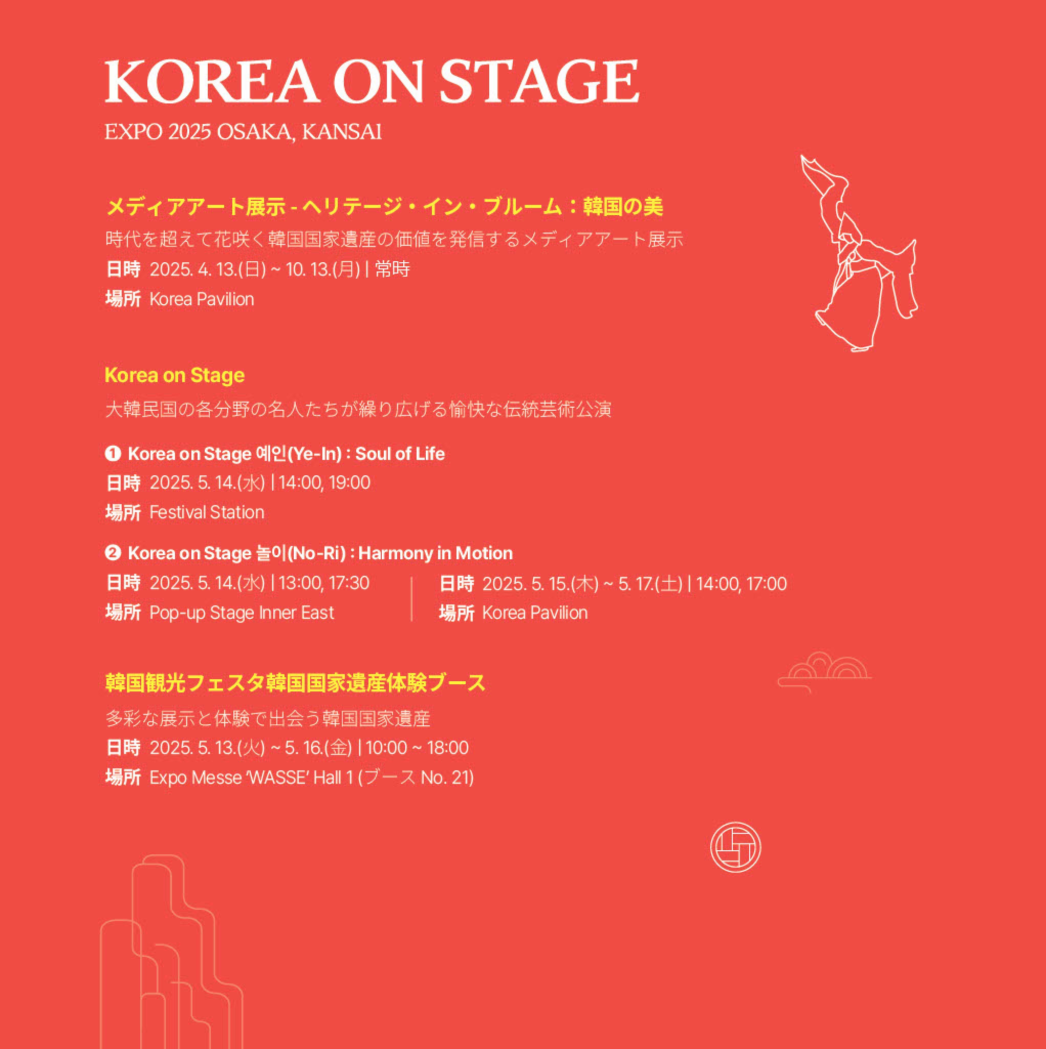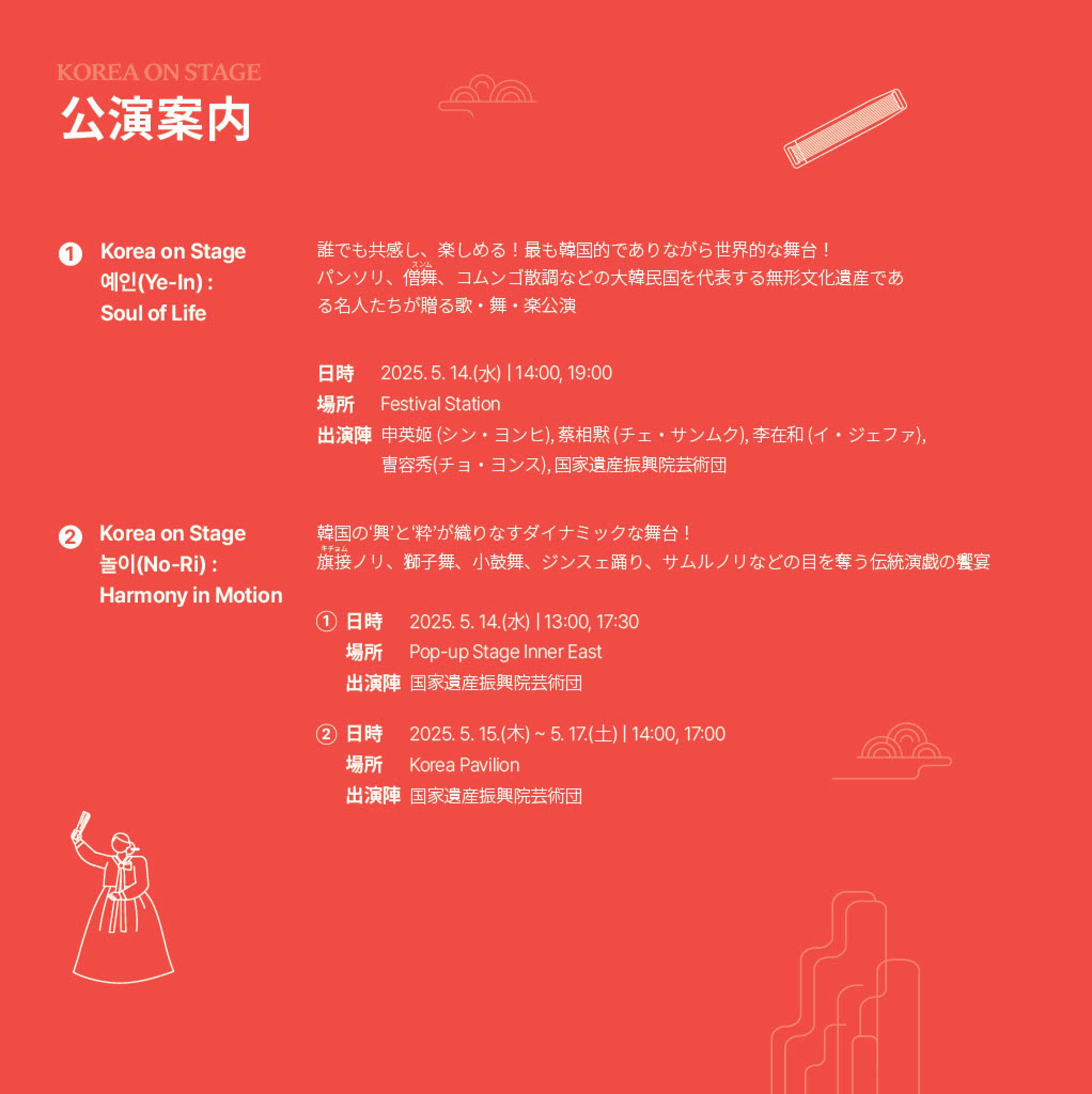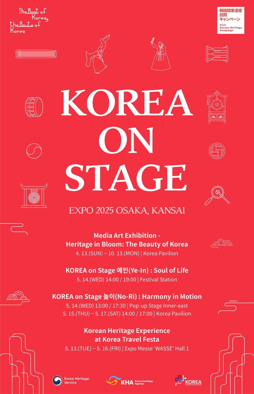 「Korea on Stage」および「韓国国家遺産訪問キャンペーン」の詳細は、公式ウェブサイト(www.kh.or.kr/visit)、Instagram(@visitkoreanheritage、@koreapavilion_2025)でご確認ください。