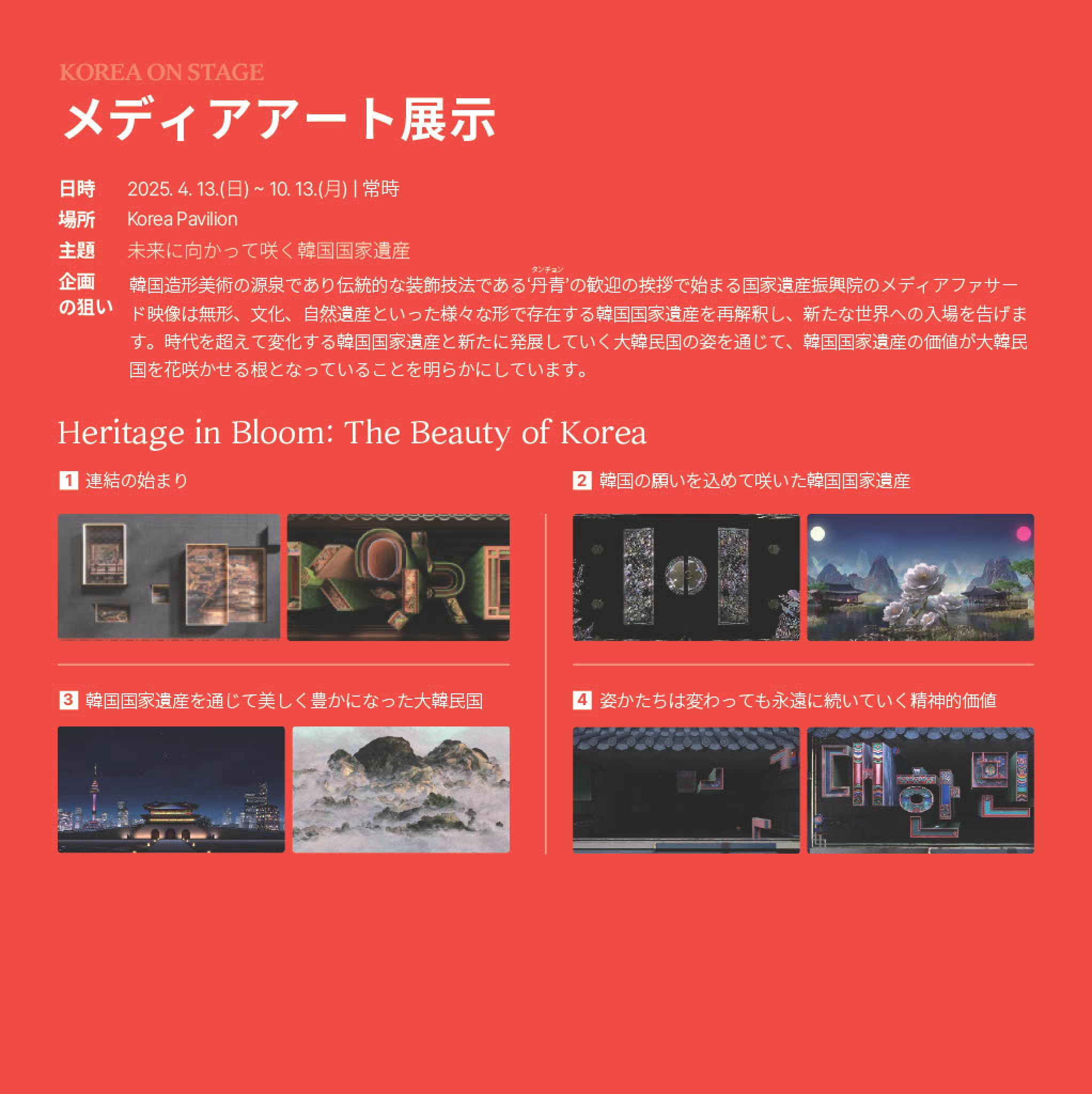 韓国の象徴的な国家遺産を現代の感覚で再構成したメディアアート作品『Heritage in Bloom: The Beauty of Korea (未来へ花開く韓国の遺産)』は、万博期間中、韓国館前の大型LEDスクリーン(横27m・縦10m)で常時上映されます。韓国の伝統文様である「十長生」、「日月五峰図」、韓山モシ、「仁王霽色図」などがデジタル映像でよみがえり、観客に新しい視覚体験を提供します。