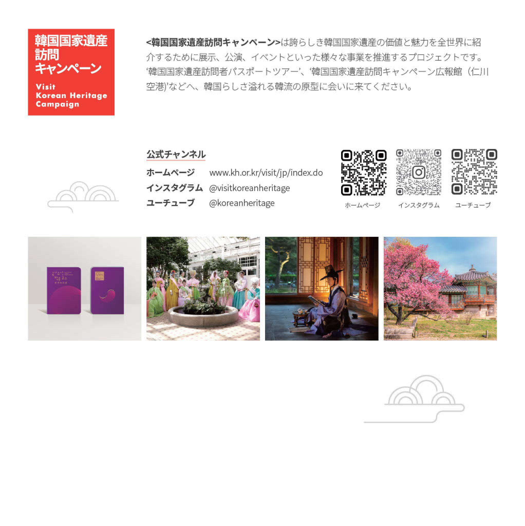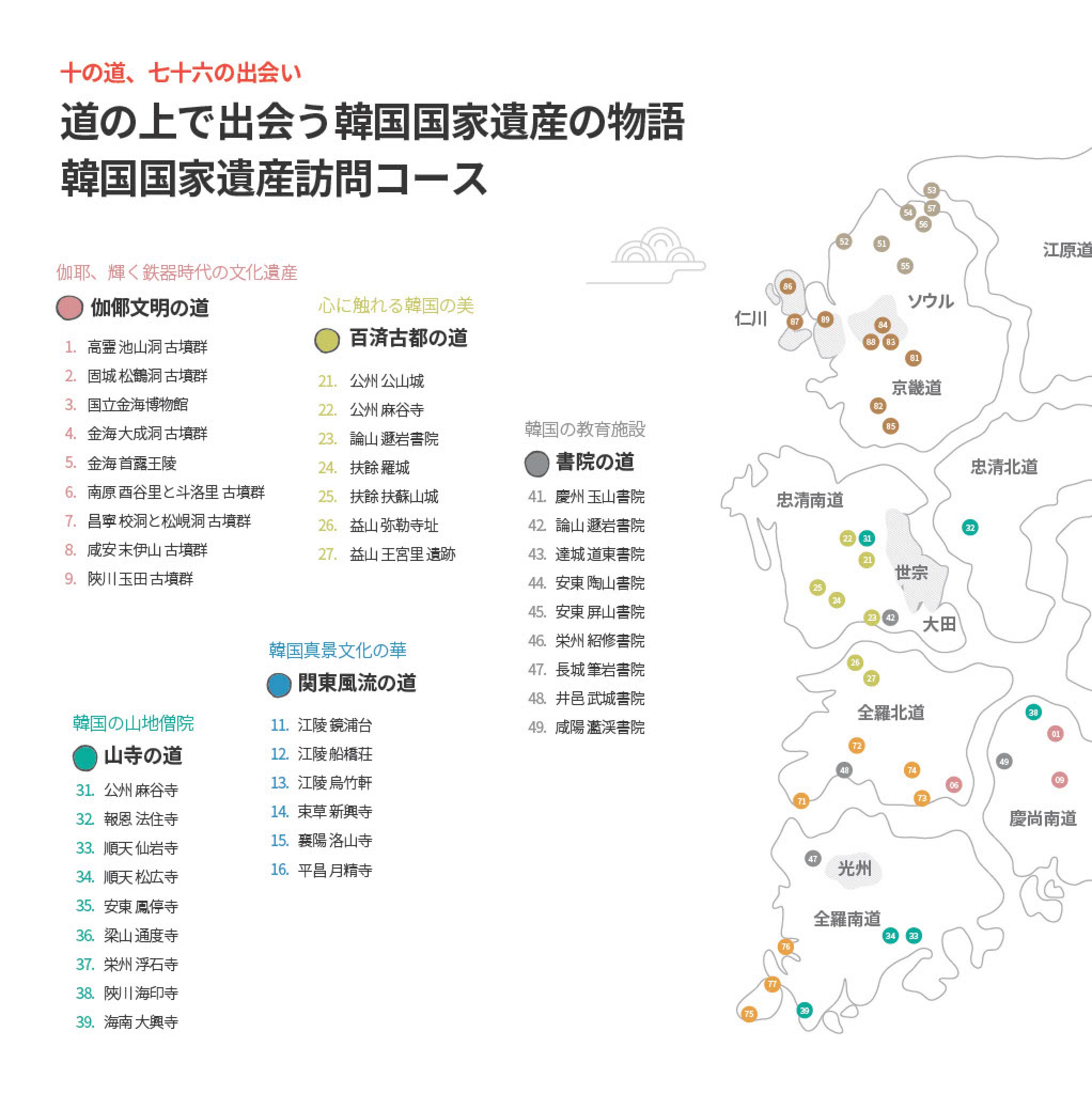 ※ 韓国国家遺産訪問キャンペーンとはユネスコ世界遺産や人類無形文化遺産を中心に、韓国各地に点在する国家遺産の魅力を国内外に広く発信することを目的としたプロジェクトです。本キャンペーンは、テーマ別に設定された10の道および76カ所の主要拠点で構成されています。訪問コースは(1) 伽倻(カヤ)文明の道、(2) 関東風流の道、(3) 百済古都の道、(4) 山寺の道、(5) 書院の道、(6) 先史地質の道、(7) 説話と自然の道、(8) 音(ソリ)の道、(9) 王家の道、(10) 千年精神の道。各ルートや拠点に関する詳細情報は、キャンペーン公式サイト(www.kh.or.kr/visit)にてご覧いただけます。