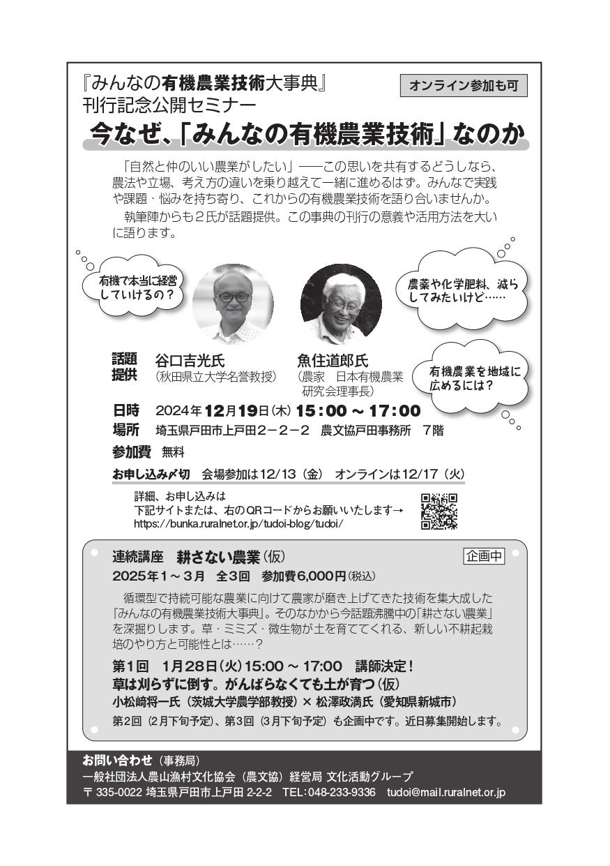 本書の発売を記念して、刊行記念公開セミナー『今なぜ、「みんなの有機農業技術」なのか』が2024年12月19日(木)15:00-17:00に開催されます。オンライン参加の申込は12月7日(土)締切。お早めにお申し込みください!