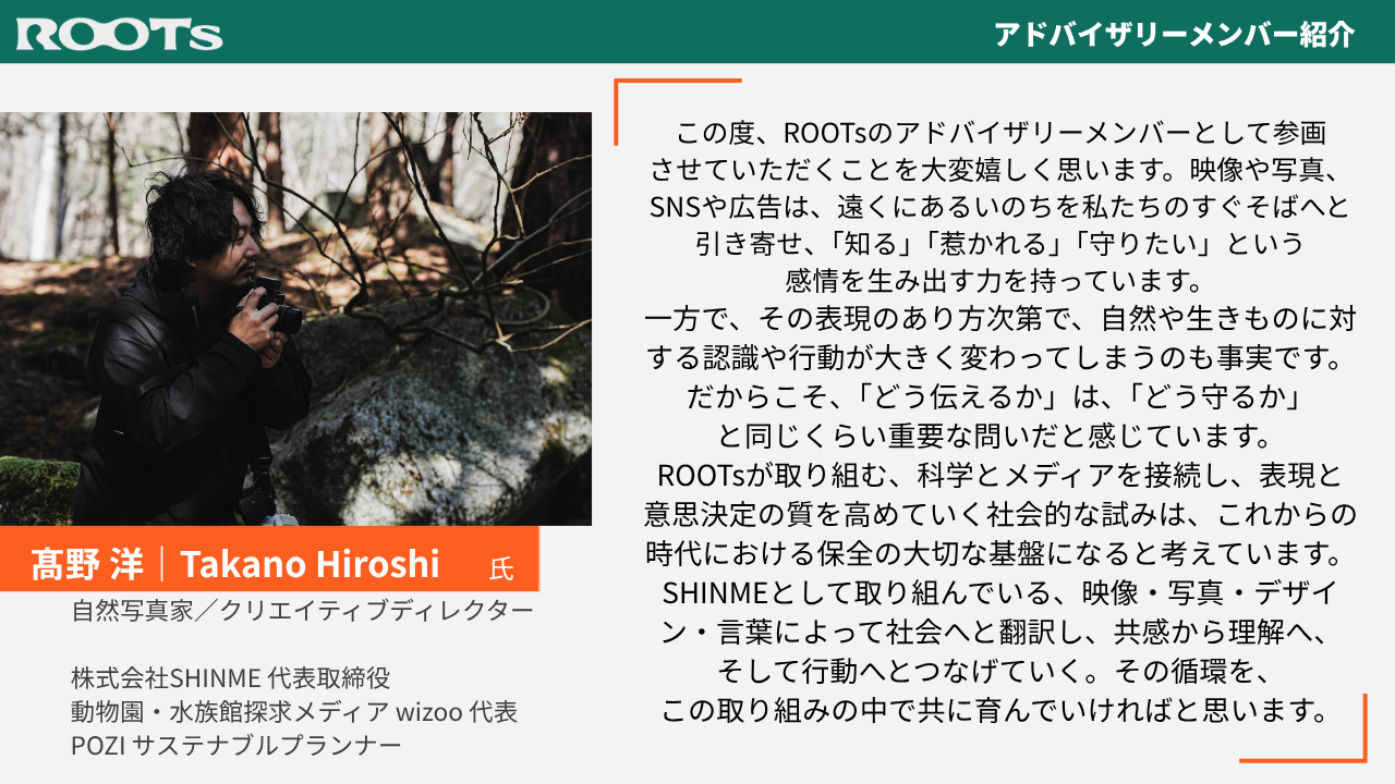 だからこそROOTsは、メディアと生物多様性の関係を研究・可視化し、科学とメディアを結ぶ仕組みづくりを通じて、人と生きものの未来につながる意思決定を支えることをミッションとしています。