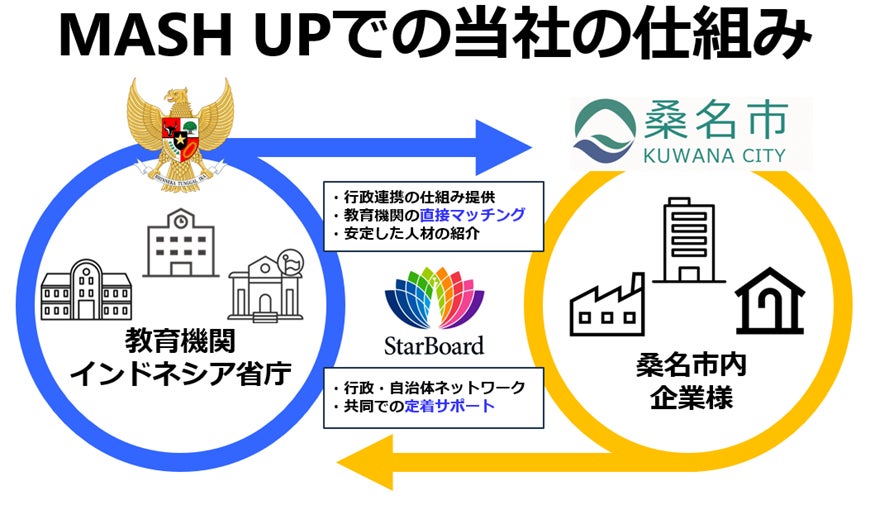 StarBoardは本プログラムにおいて、インドネシア人材と桑名市の企業を直接つなぎ、市内の企業に優秀なインドネシア人材を紹介するとともに、桑名市と協力しながら受け入れ人材のサポートと定着化を図る共創プランを提案しました。当社は2024年8月にインドネシア保険省と人材育成に関する相互協定を締結しており、インドネシア特化型の強みを活かした安定的な人材紹介の実現が期待されています。従来の人材会社が個社単独で企業へ人とマッチングするのに対し、当社ではインドネシアと桑名市の行政連携の仕組みの元で、継続的安定的な人材の供給とサポートを行って参ります。