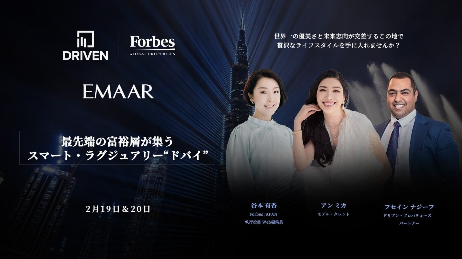 ドバイ拠点の不動産仲介会社ドリブン・プロパティーズ(Driven Properties LLC 本社:ドバイ CEO:アブダラ・アラジャジ)は、国民的モデル・タレントのアン ミカとジャーナリストの谷本 有香をゲストに迎えドバイ現地のトークショーイベント兼ツアー「先端の富裕層が集うスマート・ラグジュアリー“ドバイ” 」を開催することをお知らせいたします。