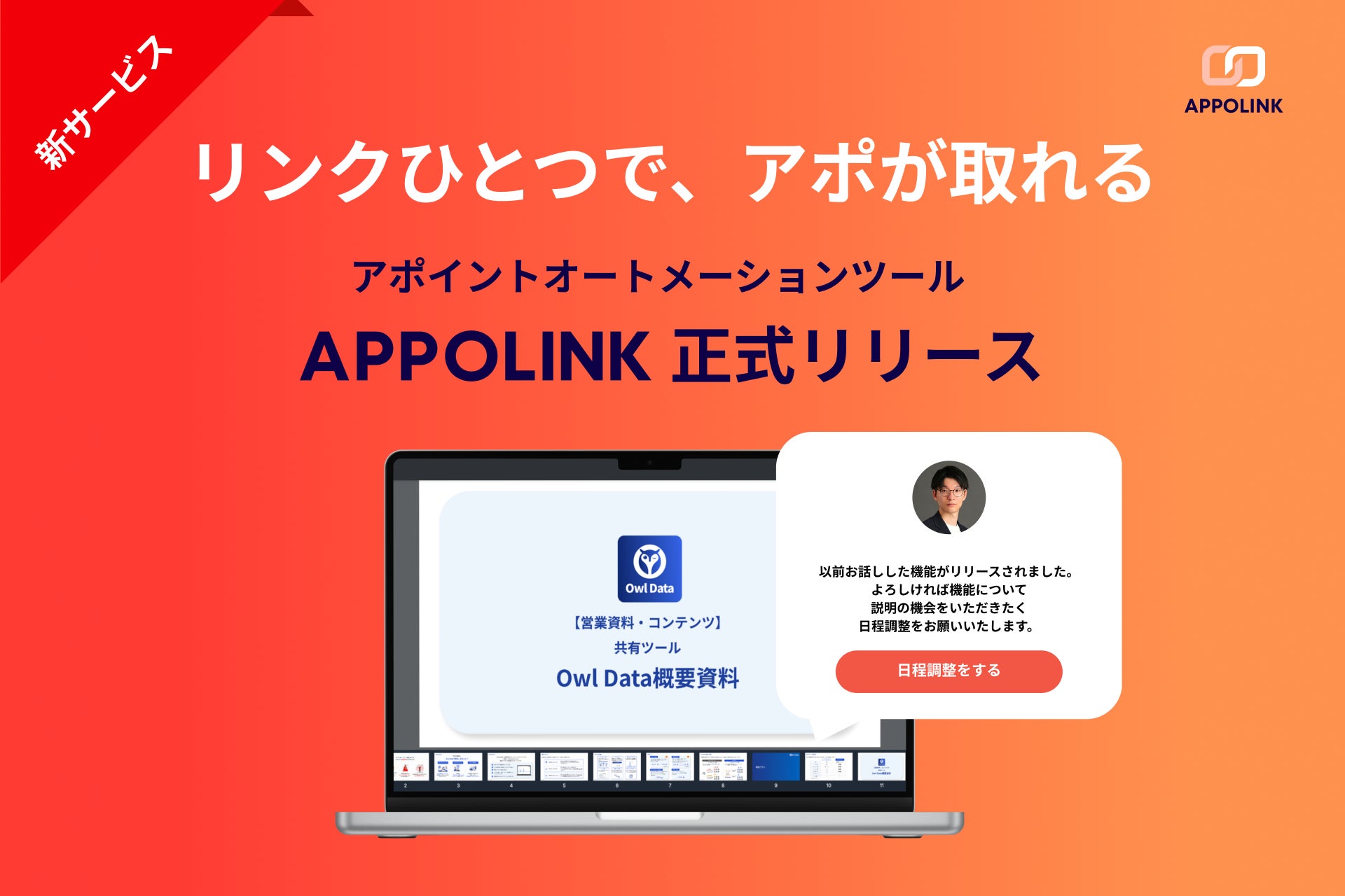 株式会社Owl Data(本社:東京都渋谷区、代表取締役:中村優太 以下、Owl Data)は、リンクからアポを生み出す新サービス「APPOLINK(アポリンク)」を正式リリースしたことをお知らせします。