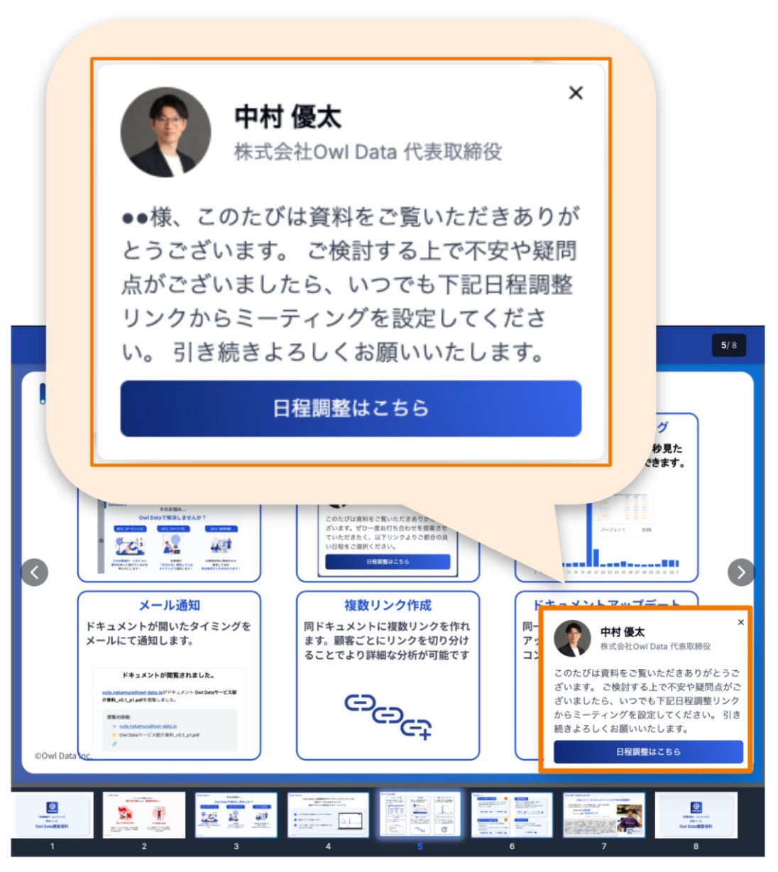 資料の読了率や滞在時間などの詳細な分析機能により、コンテンツの質を可視化。どのページで離脱しているか、どの部分に興味を持っているかなどを把握し、マーケティング施策の改善に活用できます。