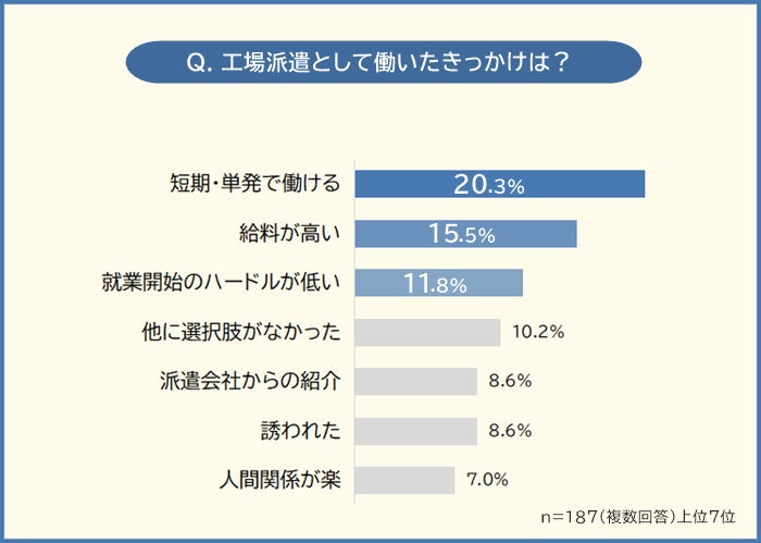 工場派遣として働いたきっかけの1位は「短期・単発で働ける(20.3%)」でした。2位「給料が高い(15.5%)」、3位「就業開始のハードルが低い(11.8%)」が続きます。