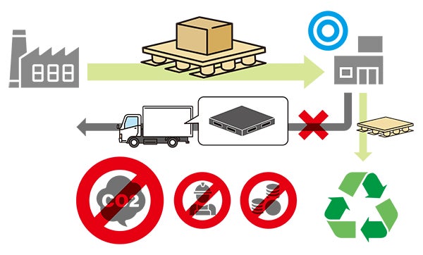 パレット単位で荷物を出荷先から最終納品先である小売店舗まで中間物流を介すことなく「ダイレクト」に「ワンウェイ」で、効率的な一貫パレチゼーションを実現することで、輸送に伴うコストと工数の削減を図ること、また、環境配慮型のリサイクル可能な合紙製パレットを使用し、パレット回収のための輸送を削減することにより、CO₂排出量の削減を図ることを実現します。