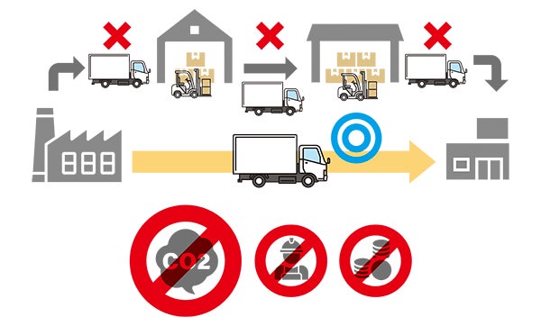 当社グループが進める、パレット単位で生産地から最終納品先まで「直送」する「DDロジ」は、中間物流を削減することで、物流コスト・荷役作業を削減し、さらにトラックなどの車両の稼働自体を減らすことにより、CO₂の大幅削減を目指す、まったく新しい輸送商品です。