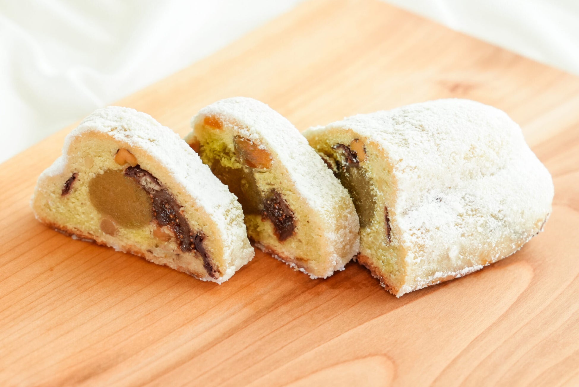 ■毎年大人気のシェシバタのシュトーレン、今年は5種類のドライフルーツとアーモンドナッツやヘーゼルナッツを贅沢に使用した「シュトーレン エクストラ」、風味豊かな2種類のピスタチオを使用した「シュトーレン ピスターシュ」の2種類を販売いたします。