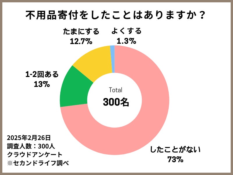 実際に不用品寄付を「したことがない」人は219名(73%)に上り、「1-2回したことがある」が39名(13%)、「たまにする」が38名(12.7%)、「よくする」は4名(1.3%)にとどまりました。