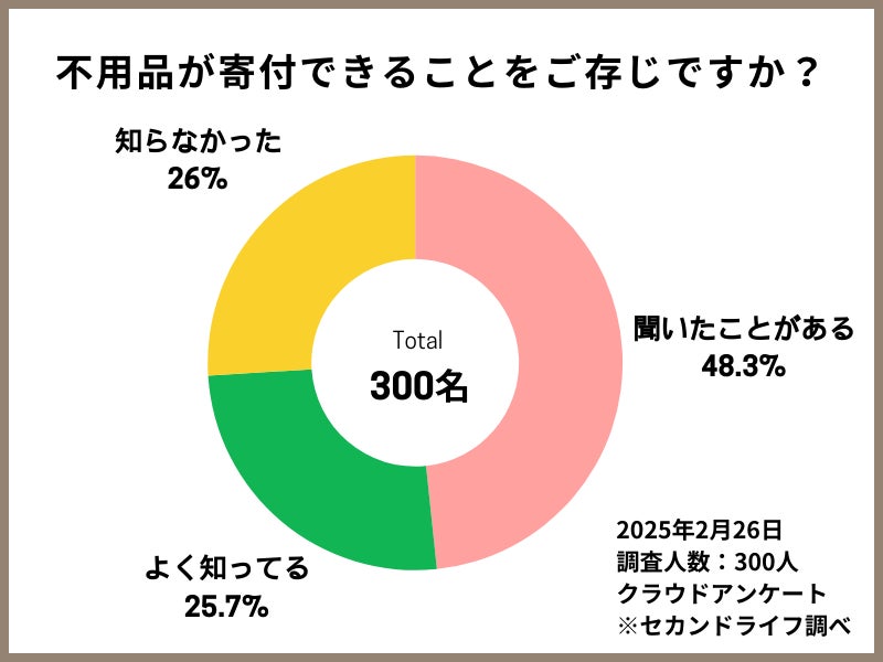 不用品寄付について、「聞いたことはある」が145名(48.3%)、「よく知っている」が77名(25.7%)と、全体の74%が認知している一方で、「知らなかった」も78名(26%)いることがわかりました。