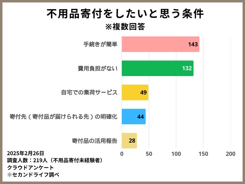 不用品寄付を促進する条件としては、「手続きが簡単」(142名)と「費用負担がない」(132名)が圧倒的に多く、「自宅での集荷サービス」も49名が希望しています。