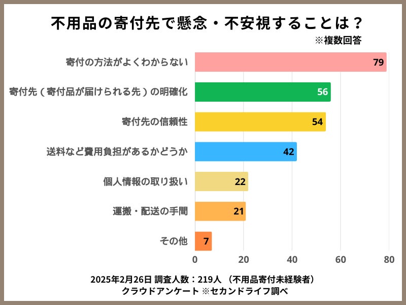 寄付をする際の懸念点・重要視することとしては、「寄付の方法がわからない」(79名)が最も多く、次いで「寄付先(寄付品が届けられる先)の明確化」(56名)、「寄付先の信頼性」(54名)と続いており、情報不足や不透明さが大きな障壁となっていることがわかります。