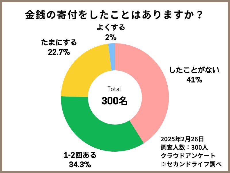 金銭や物品の寄付全般については、「したことがない」が123名(41%)、「1-2回したことがある」が103名(34.3%)、「たまにする」が68名(22.7%)、「よくする」は6名(2%)と、不用品寄付よりも経験者が多いことが判明しました。