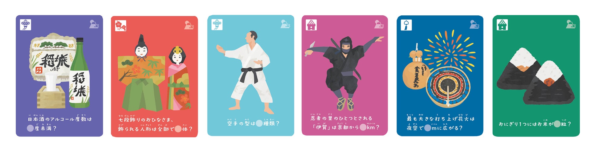 カードの表面には数字で答えられるクイズ、裏面には答えと雑学が記載されています。ポップなイラストとともに、日本文化の魅力を楽しく学ぶことができます。