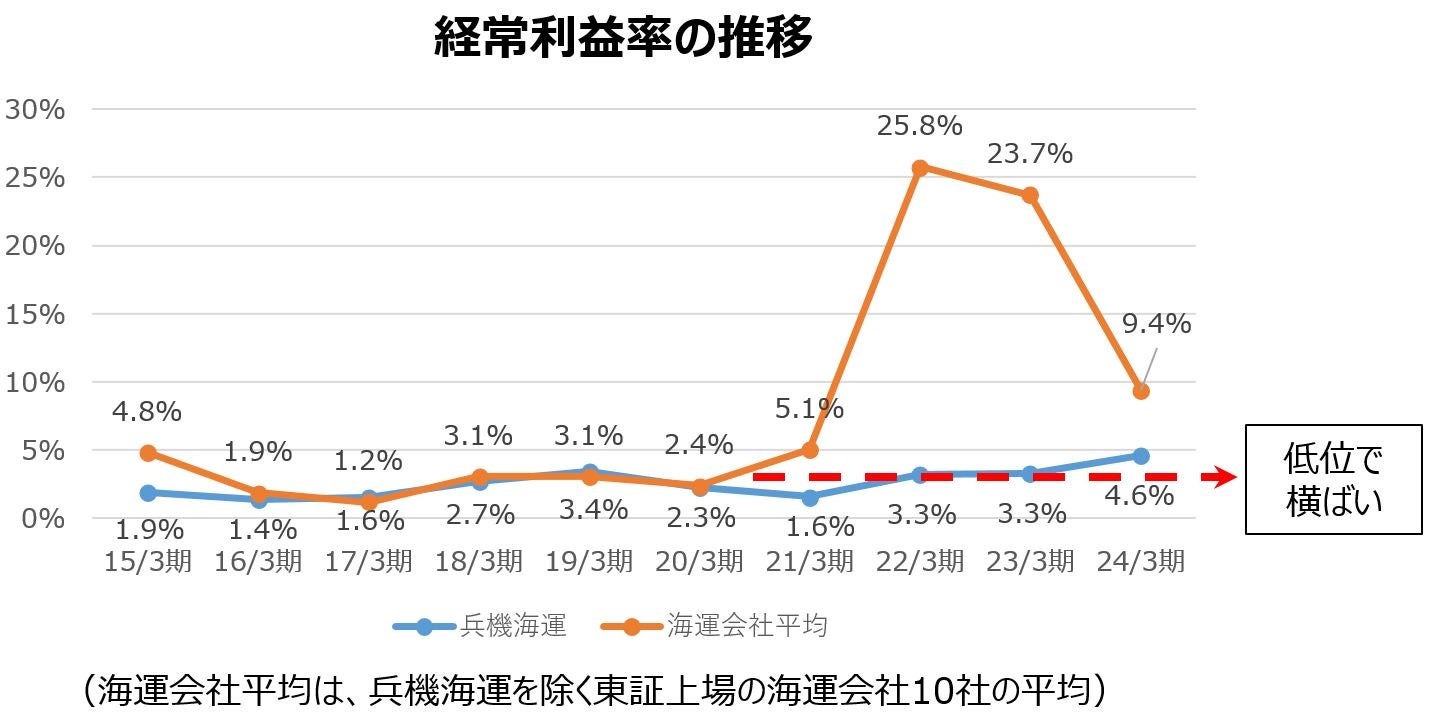 収益性についても、海運事業を主たる事業とされているところ、同業他社比で見劣りをしております。現状の商圏の拡張では収益構造が変わらないため、利益率の改善には限界があると考えます。