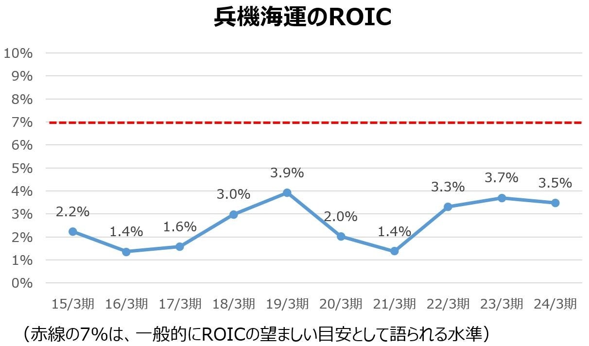 近年、資本効率を意識した経営管理の指標として、ROIC(投下資本利益率)に焦点が当たっております。兵機海運様のROICを試算したところ3%台にあり、利益率の水準としてはより高めていく余地があるかと拝察しております。