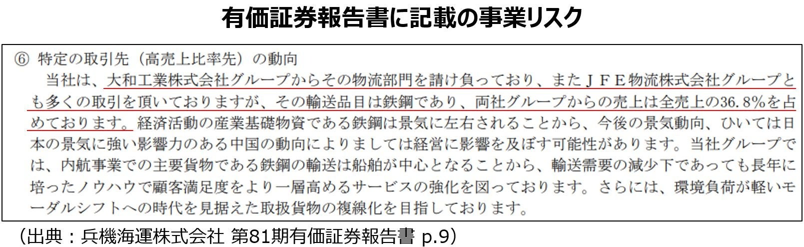大和工業様からの売上が3割近くを占め、有価証券報告書において長年にわたり、特定の取引先(高売上比率先)の動向が事業等のリスクとして述べられております。富洋海運グループからの提案は、現状の閉塞感を打破する策であると共に売上集中リスクの低減という重要な経営テーマにも自ずと対処できるものであり、更に兵機海運様の事業ポートフォリオ形成上の矛盾もございません。