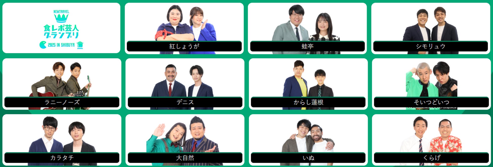 渋谷よしもと漫才劇場で活動する人気芸人11組は、「面白く×美味しく」をテーマに、おすすめの飲食店で食レポした動画を「NewTravel」に投稿します。「NewTravel」ユーザーは、イベント開催期間中にお気に入りの動画への「いいね❤」で各動画に投票することができ、最も多くの投票を獲得した芸人が優勝(食レポ王)となります。