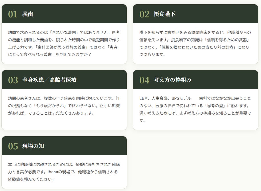 Ihana訪問歯科では、独自のDX基盤による情報共有の効率化と、スタッフが主体的に動く理念経営を組み合わせることで、質の高い医療と持続可能な医院経営の両立を実践してきました。本構想は、こうした現場で培われた実践知を志を共にする歯科医師へ共有し、地域医療を支える新しい歯科医師モデルの育成を目的として立ち上げたものです。