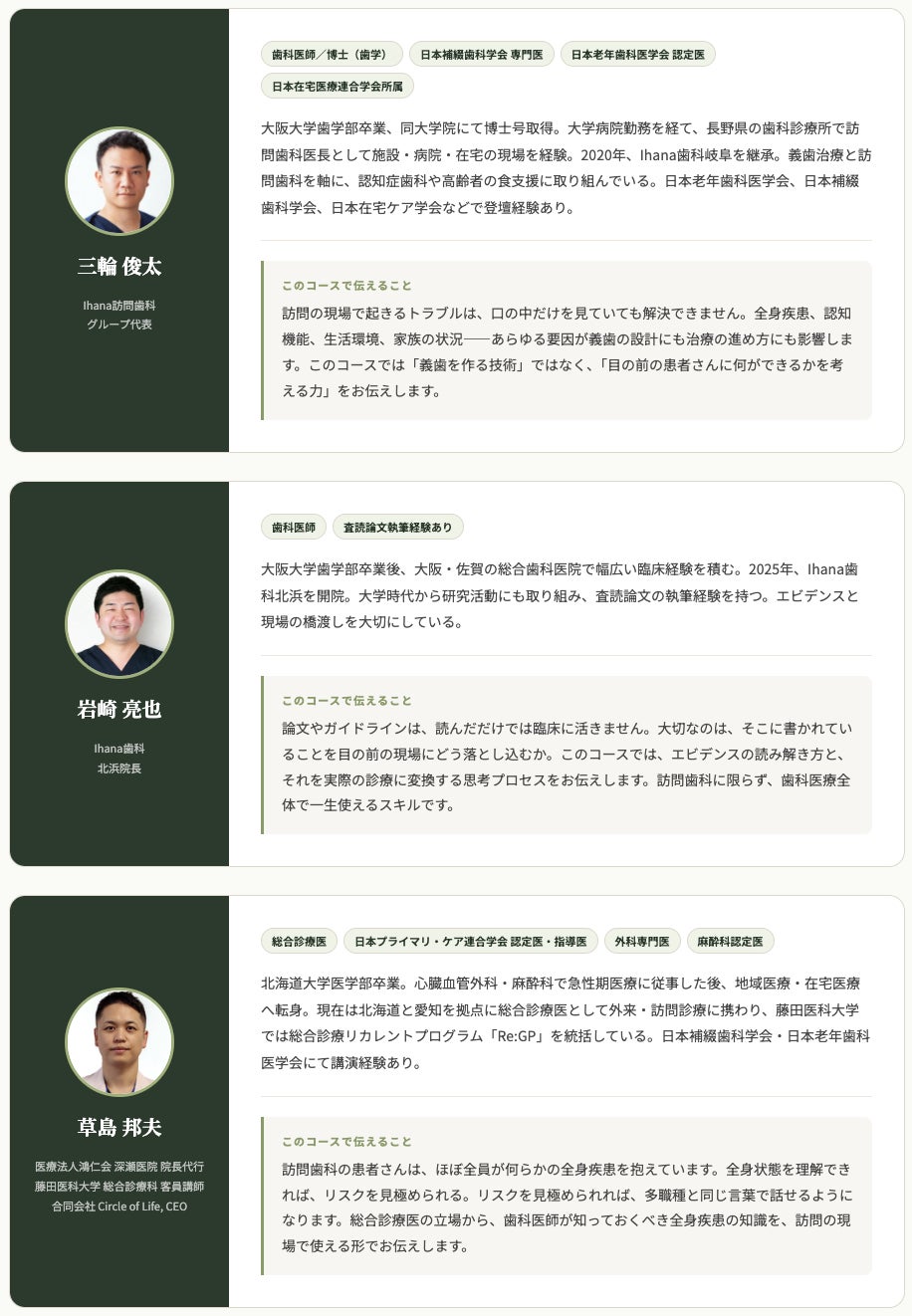 目の前の患者さんは認知症で、全身疾患があり、家族も不安を抱えている。口の中だけ見ていても何も始まらない。「ちゃんとした訪問歯科」を求め、施設や在宅で何年もかけて向き合って見えてきた答えを、このコースに込めました。
