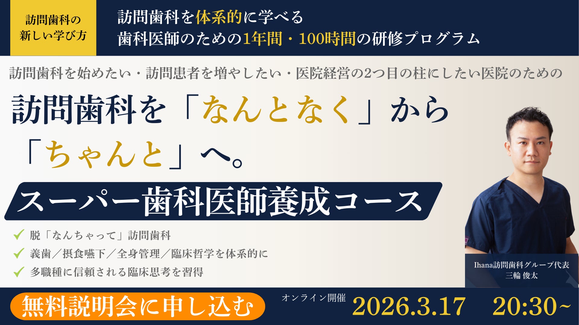 ~訪問歯科に必要な臨床・全身管理・多職種連携を1年間で体系的に習得。3月17日(火)20:30より無料オンライン説明会開催~