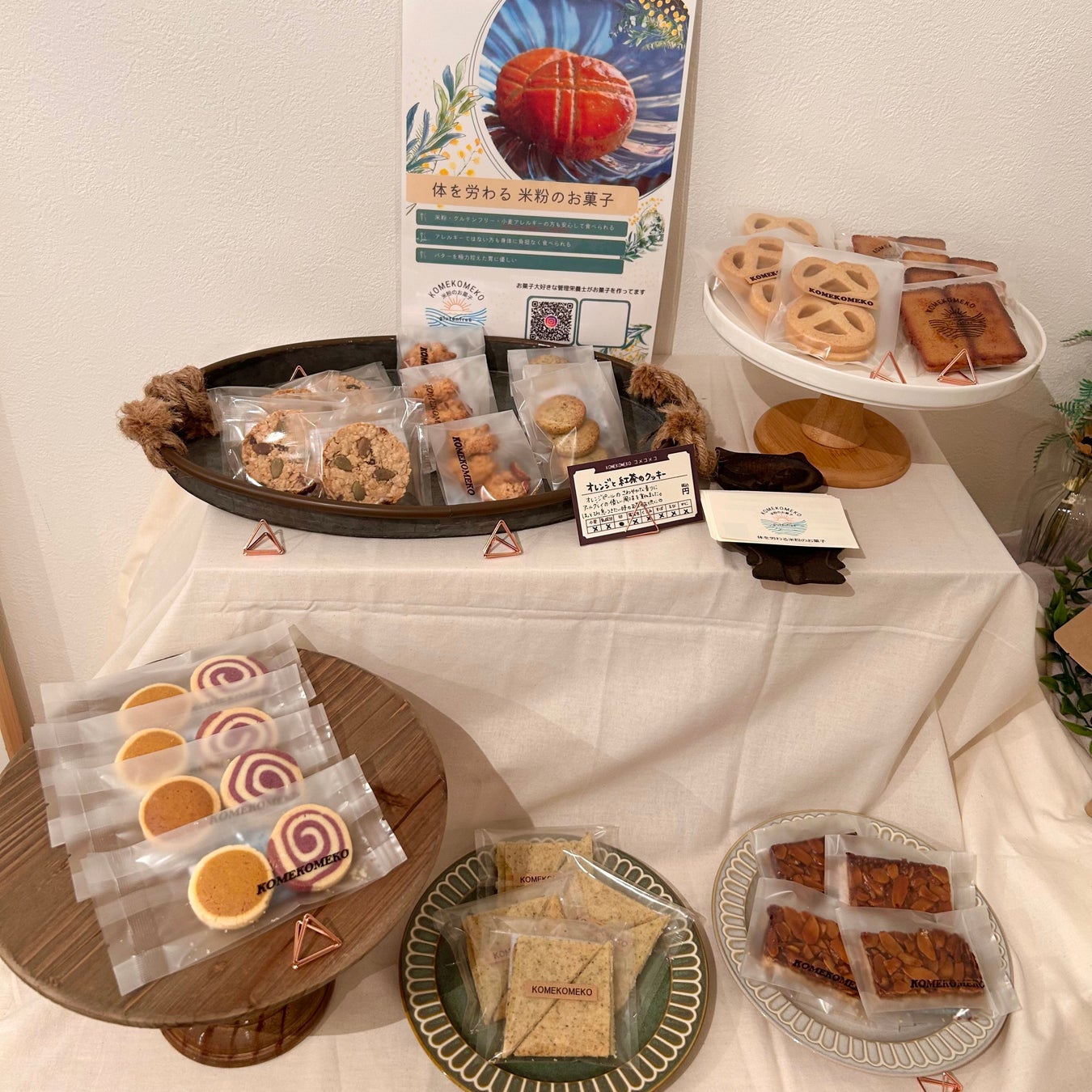 続いて、グルテンフリースイーツブランド「KOMEKOMEKO」の米粉お菓子。高知生まれのブランドで、身体にやさしく、見た目も華やか。クッキーやタルトなど、手土産や自分へのご褒美にぴったりのラインナップです。