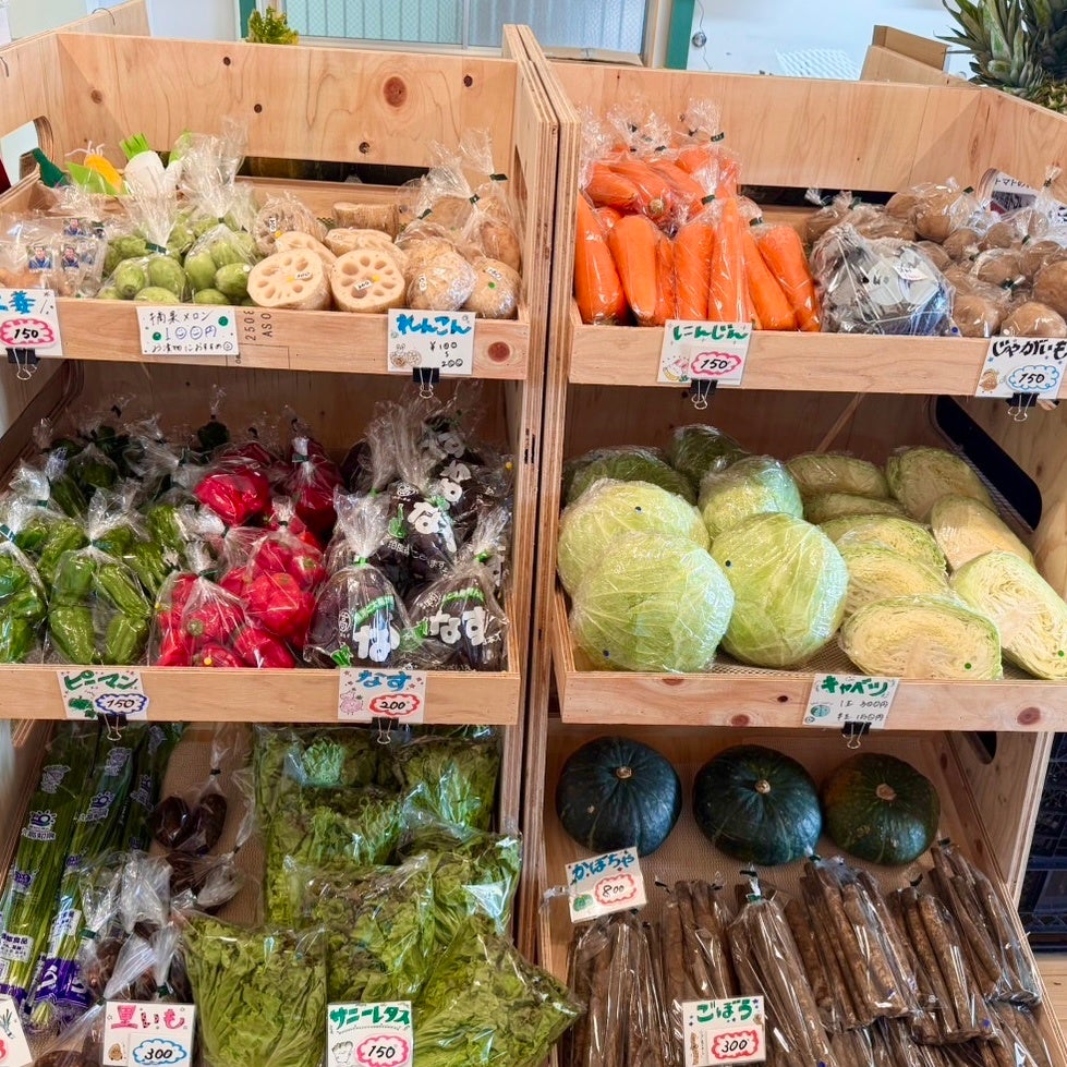 店内には、その朝に市場や地元の農家から届いたばかりの新鮮な野菜がずらりと並びます。ピーマンやナス、レンコン、キャベツ、人参など、一つひとつ丁寧に袋詰めされ、温かみのある手書きPOPとともに陳列されており、売り場全体に活気とぬくもりが漂っています。特に目を引くのは、どこか“発掘棚”を思わせるディスプレイ。商品棚の奥に手を伸ばせば、まるでお宝を見つけるような感覚で、毎日の買い物が少し特別な体験になります。「セレクトショップ的」な遊び心と偶然の出会いを楽しめる空間は、買い物以上のワクワク感を届けてくれます。