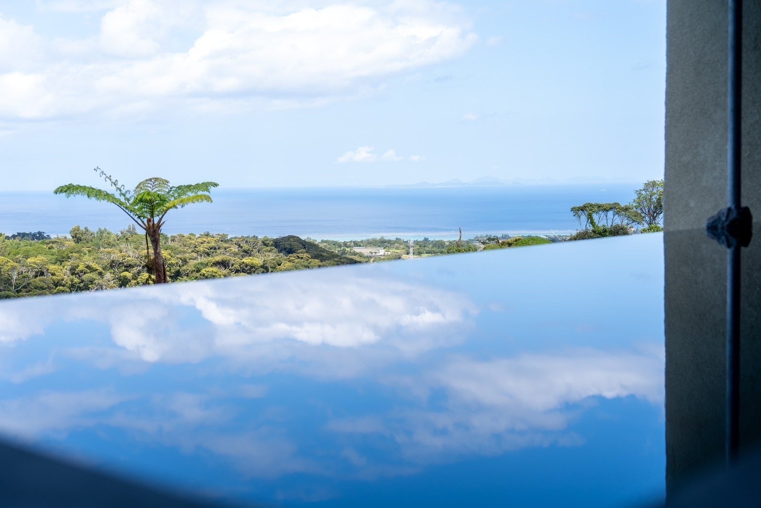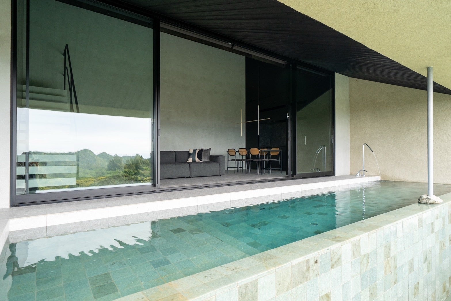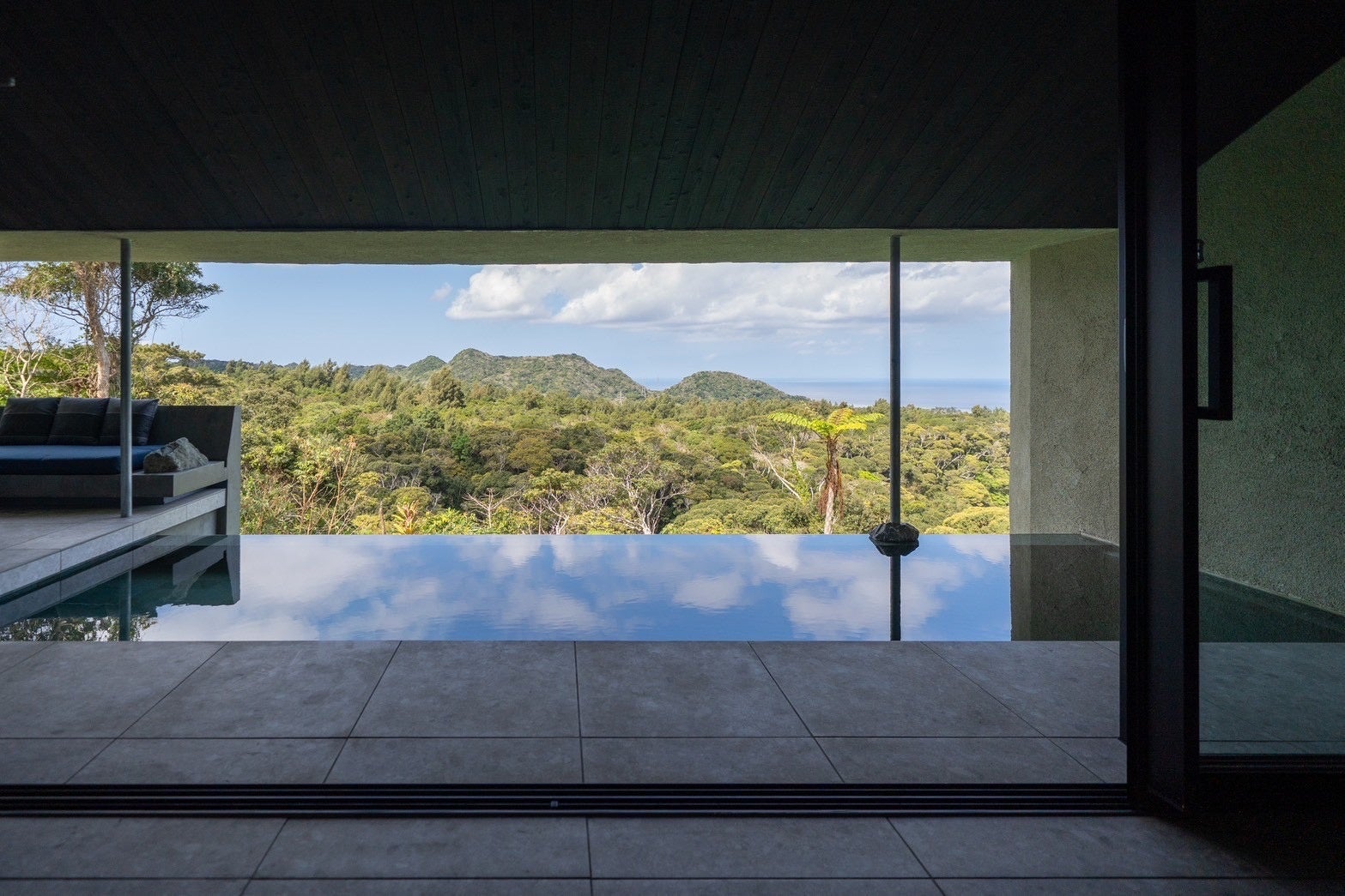 また、プールの水は雨水を濾過循環する設備RE AQUA(https://fuudesigns.com/re-aqua/)を取り入れ、ミネラルで水を綺麗にする試みを行っている。水不足の沖縄北部で、水の利用を極力少なくすることを目指しています。