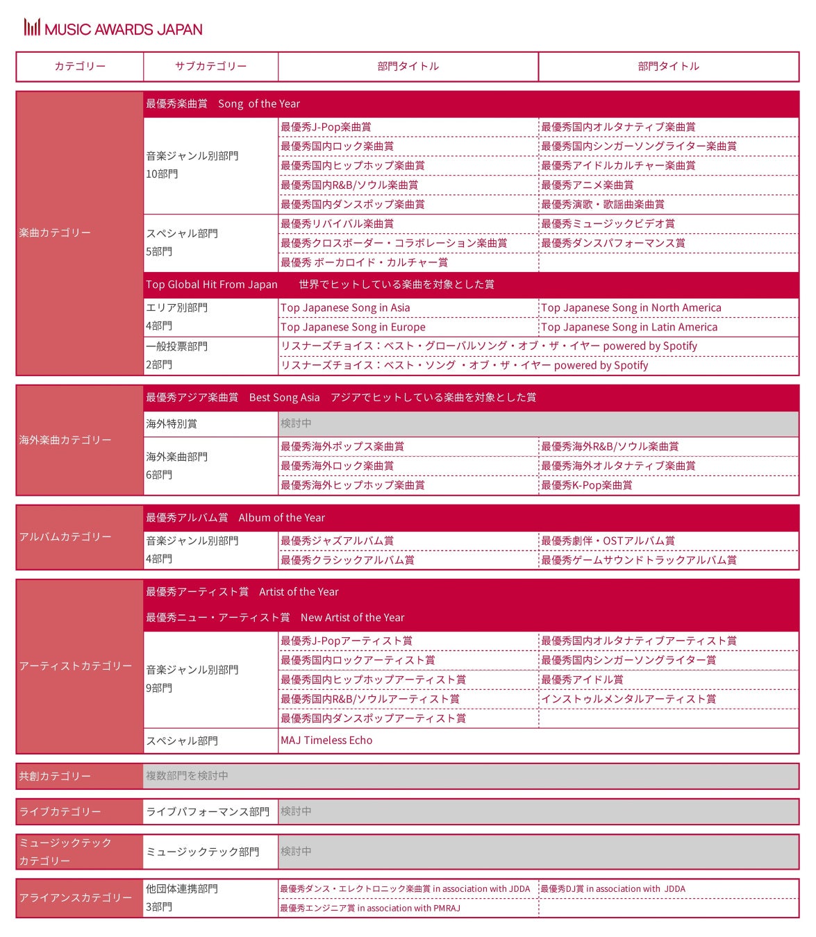 音楽業界の主要5団体(日本レコード協会、日本音楽事業者協会、日本音楽制作者連盟、日本音楽出版社協会、コンサートプロモーターズ協会)が垣根を越えて新設したアワード「MUSIC AWARDS JAPAN」(MAJ)に創設される予定の「60以上の表彰部門の詳細・投票方法」、「5,000人以上の投票メンバーの選定・投票方法」についてお知らせいたします。
