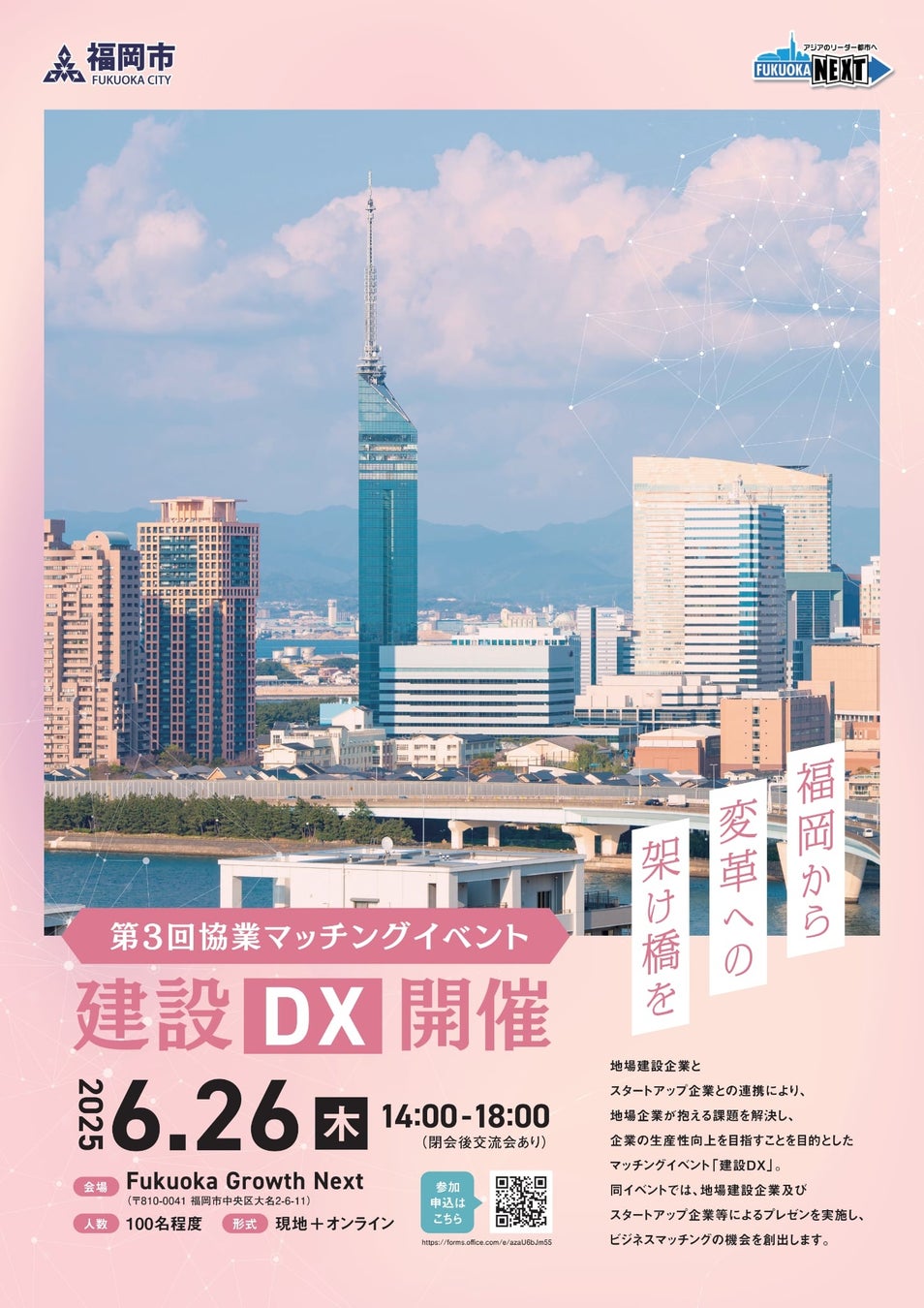 福岡市道路下水道局では、建設業界の生産性向上に向けた取組み等を支援するため、地場建設企業とスタートアップ企業等との連携機会を創出すべく、「第3回 協業マッチングイベント『建設DX』」を開催します。