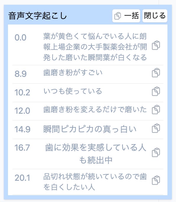 また、テキスト化された文言はワンクリックで全文もしくはフレーズごとにコピーができるようになっているため、修正の指示出しなどにもご活用いただけます。