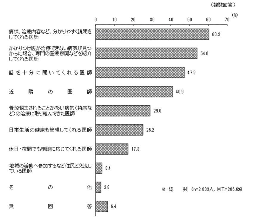 内閣府世論調査の「かかりつけ医を選ぶ際に重視していること」のアンケートによると、病状・治療内容など、分かりやすく説明をしてくれる医師が60.3%、かかりつけ医が治療できない場合は、専門機関を紹介してくれる医師が54.0%と、身近で相談しやすく、自分や家族の健康を気軽に託せる医師の存在を望んでいます。