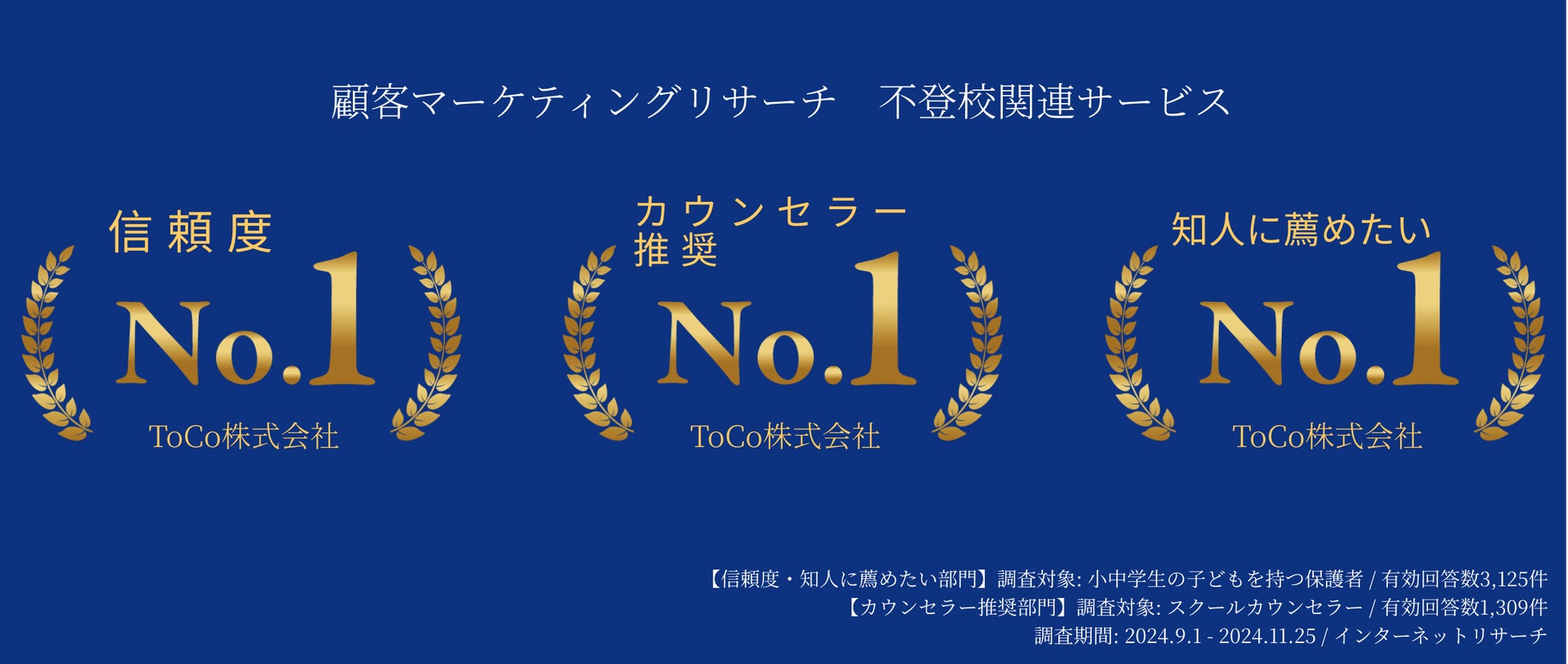 2024年12月16日、ToCo株式会社(本社:東京都渋谷区、CEO:青山登)が提供する不登校支援サービス「ToCo」は、2024年9月1日から11月25日にかけて実施された顧客マーケティングリサーチにおいて、「信頼度No.1」「専門家推奨No.1」「知人に薦めたいサービスNo.1」の3部門でトップ評価を獲得しました。調査は、小中学生の保護者3,125名とスクールカウンセラー1,309名の有効回答を基に実施され、不登校支援における革新的なアプローチが多くの家庭や専門家から支持を得ていることが明らかになりました。