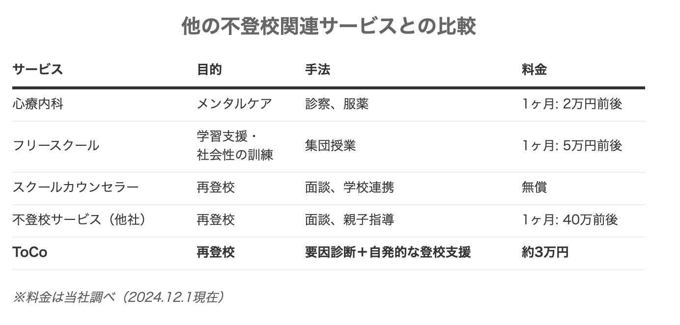 ToCo株式会社は、今後もAI技術のさらなる進化とサービスの質の向上を目指し、不登校に悩む家庭や教育現場への支援を強化していきます。すべての子どもが自信を持って学校生活を送れる社会の実現に向け、取り組みを続けてまいります。