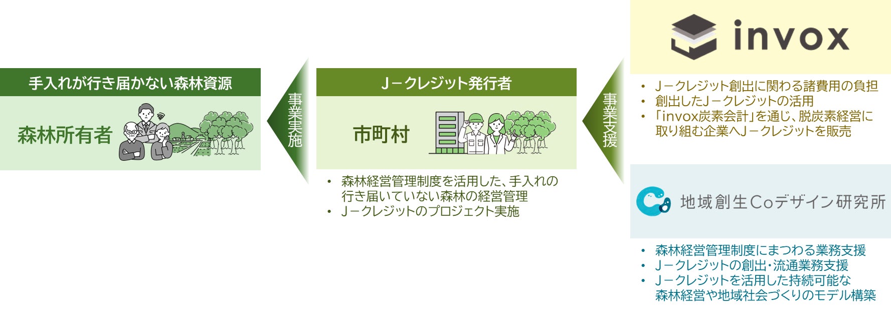株式会社invox(代表取締役 横井 朗/以下、invox)と株式会社地域創生Coデザイン研究所(代表取締役所長 北山 泰三/以下、地域創生Coデザイン研究所)は、森林経営管理制度※1により市町村が経営管理を行う、これまで手入れの行き届いていなかった森林を対象としたJ-クレジット※2創出・活用の拡大に向け連携を開始しました。またあわせて、従来は採算が合いづらかった小規模山林でのJ-クレジットの取り組みも加速することで、持続可能な森林経営の更なる促進と地域創生の実現をめざします。