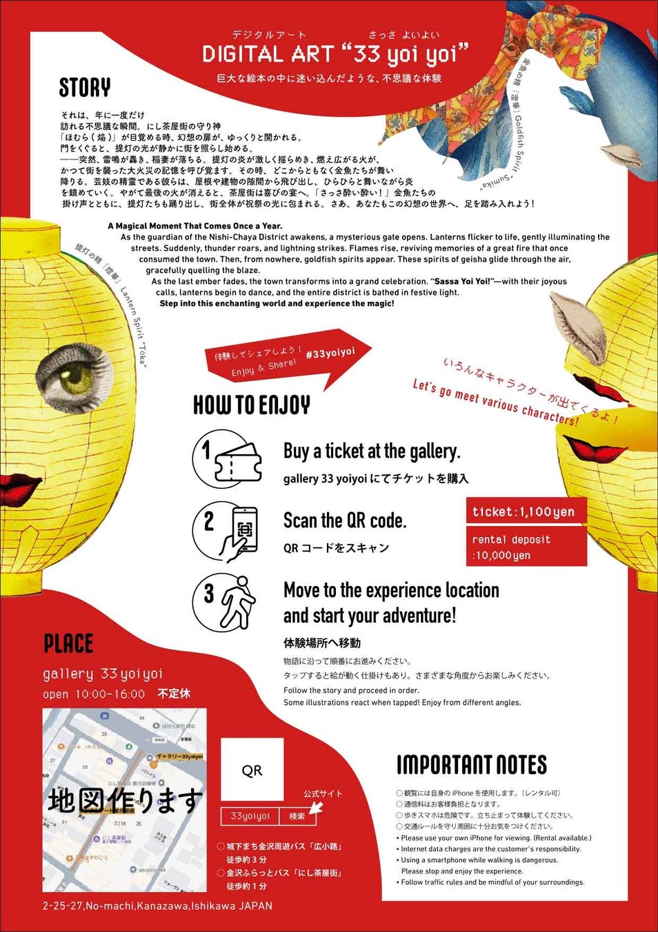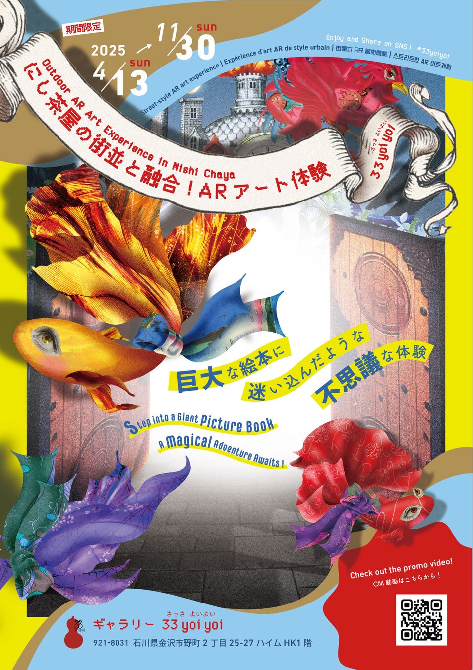 合同会社かなざわざ(本社:石川県金沢市、代表:澤田 雅美)は、2025年4月13日(日)から11月30日(日)までの期間、金沢市にし茶屋街にて、AR(拡張現実)アート展示「33yoiyoi(さっさよいよい)」を開催中。