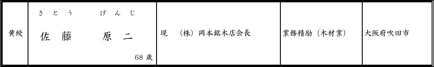株式会社岡本銘木店(本社:大阪府吹田市、代表:佐藤 朋子、以下 当社)は、当社代表取締役会長の佐藤原二(さとう げんじ)が、令和6年秋の褒章にて「黄綬褒章(おうじゅほうしょう)」を受章したことをお知らせいたします。