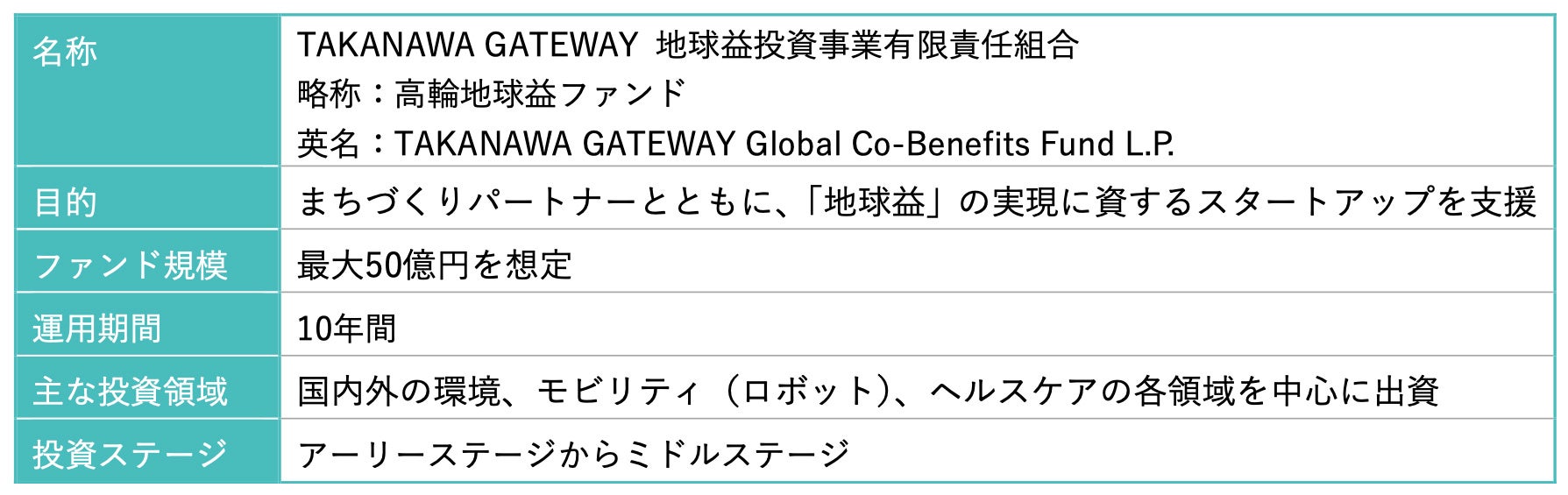 さらに、ファイナンス面からも社会実装を支援するため、新たに「TAKANAWAGATEWAY 地球益 投資事業有限責任組合」(略称:高輪地球益ファンド)を設立し、TAKANAWA GATEWAY CITYを拠 点とした広域スタートアップエコシステムを強化します。